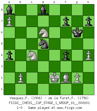 Last move : 1-0 2017 June 28 22:24:51 [Event "FICGS__CHESS__CUP_STAGE_1_GROUP_10__000001"] [Site "FICGS"] [Date "2017.03.01"] [Round "1"] [White "Vasquez,Fernando"] [Black "de la Foret,Fred"] [Result "1-0"] [WhiteElo "1906"] [BlackElo "1796"] 1.e4 c5 2.c3 d6 3.d4 Nf6 4.Bd3 g6 5.Nf3 Bg7 6.O-O O-O 7.h3 Nbd7 8.Re1 Re8 9.e5 Nd5 10.dxc5 dxe5 11.Bxg6 Nxc5 12.Bc2 e4 13.Ng5 Nf6 14.Nd2 Bf5 15.Qe2 Nd3 16.Rd1 e3 17.fxe3 Nf4 18.exf4 Bxc2 19.Re1 Bg6 20.Nb3 Qc7 21.Nf3 Rac8 22.Qe5 e6 23.Qxc7 Rxc7 24.Be3 b5 25.Nbd4 a6 26.a4 b4 27.cxb4 Nd5 28.f5 exf5 29.Bf2 Rxe1+ 30.Bxe1 f4 31.b5 axb5 32.a5 Rc4 33.a6 Nc7 34.a7 Be4 35.Bf2 Ra4 36.Rxa4 bxa4 37.h4 Ba8 38.Nd2 Nd5 39.Nc4 Kf8 40.Nf5 Bf6 41.Nfd6 Kg7 42.Ne4 Be7 43.Kf1 Kg6 44.Ned6 Bd8 45.Ke2 1-0 This chess game has been lost on time (started : 2017.03.01 0:58:49) Sicilian : Alapin's variation (2.c3) Kingside Castling by player White (move 6) Kingside Castling by player Black (move 6) Player White won this chess game. Follow this game move after move (download)I'd rather have a Pawn than a finger. (Reuben Fine) Es war undenkbar für die Behörden, dass ein sowjetischer Großmeister auf diese Art und Weise [Fischer-Taimanov 6:0] verliert, ohne dass es eine politischer Erklärung dafür gäbe. (Mark Taimanov) Yo considero que Fischer es uno de los expertos mas grandes de aperturas de siempre. (Keith Hayward) Je menace de comprendre la position. (Anonyme) Thus, what is of supreme importance in war is to attack the enemy's strategy. (Sun Tzu)