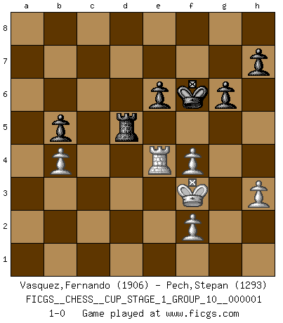Last move : 1-0 2017 June 23 22:2:17 [Event "FICGS__CHESS__CUP_STAGE_1_GROUP_10__000001"] [Site "FICGS"] [Date "2017.03.01"] [Round "1"] [White "Vasquez,Fernando"] [Black "Pech,Stepan"] [Result "1-0"] [WhiteElo "1906"] [BlackElo "1293"] 1.e4 c5 2.c3 Nf6 3.e5 Nd5 4.Nf3 e6 5.Bc4 d6 6.d4 cxd4 7.cxd4 Nc6 8.O-O Be7 9.Qe2 O-O 10.Nc3 Nxc3 11.bxc3 dxe5 12.dxe5 Qa5 13.Bb2 Rd8 14.Rfd1 Bd7 15.Bb3 Rac8 16.h3 Qc7 17.c4 Na5 18.Rac1 a6 19.Qe3 Bc6 20.Rxd8+ Qxd8 21.Nd4 Bc5 22.Bc3 b6 23.Rd1 Bb7 24.Qe2 Qc7 25.Nf3 Be7 26.Rd4 Nxb3 27.axb3 b5 28.Qd3 Bc6 29.Rg4 g6 30.Nd2 Rd8 31.Rd4 Re8 32.cxb5 axb5 33.Qg3 Bc5 34.Ne4 Bxe4 35.Rxe4 Rd8 36.Qf3 Qd7 37.Qf6 Be7 38.Qf3 Qd5 39.Bd4 Rc8 40.Kh2 Bf8 41.Rg4 Qxf3 42.gxf3 Bc5 43.Bxc5 Rxc5 44.Re4 f5 45.exf6 Kf7 46.Kg3 Rh5 47.f4 Kxf6 48.b4 Rd5 49.Kf3 1-0 Sicilian : Alapin's variation (2.c3) Kingside Castling by player White (move 8) Kingside Castling by player Black (move 9) Player White won this chess game. Follow this game move after move (download)Good positions don't win games, good moves do. (Gerald Abrahams) Ich würde die 30 stärksten Spieler der USA im Simultanspiel besiegen. (José Raúl Capablanca) Los libros de Ajedrez deben de usarse igual como usamos los anteojos: para mejorar la vista, aunque algunos jugadores los quieren usar como si ellos les otorgaran la vision. (José Raúl Capablanca) Le jeu d'échecs est comme rejeté hors du temps. (Antoine de Saint-Exupéry) I live to kill Traxler counterattack. (Ilmars Cirulis)