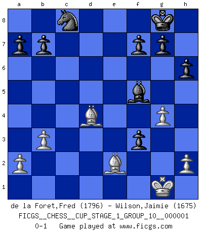 Last move : 0-1 2017 June 19 21:26:36 [Event "FICGS__CHESS__CUP_STAGE_1_GROUP_10__000001"] [Site "FICGS"] [Date "2017.03.01"] [Round "1"] [White "de la Foret,Fred"] [Black "Wilson,Jaimie"] [Result "0-1"] [WhiteElo "1796"] [BlackElo "1675"] 1.e4 c5 2.d4 cxd4 3.c3 d5 4.exd5 Qxd5 5.cxd4 Nc6 6.Nf3 e5 7.Nc3 Bb4 8.Bd2 Bxc3 9.Bxc3 e4 10.Ne5 Nxe5 11.dxe5 Ne7 12.Qe2 O-O 13.b3 Bf5 14.Qc4 Rac8 15.Qxd5 Nxd5 16.Bd2 Rfe8 17.Bc4 Rxe5 18.O-O Nb6 19.Be2 Rd5 20.Be3 h6 21.Rac1 R5d8 22.f3 Re8 23.Bd4 Rxc1 24.Rxc1 Rc8 25.Rxc8+ Nxc8 26.g4 exf3 0-1 This chess game has been lost on time (started : 2017.03.01 0:58:49) Sicilian : Smith-Morra gambit Kingside Castling by player Black (move 12) Kingside Castling by player White (move 18) Player Black won this chess game. Follow this game move after move (download)There must have been a time when men were demigods, or they could not have invented Chess. (Gustav Schenk) Es genügt nicht ein guter Spieler zu sein, man muß auch gut spielen. (Siegbert Tarrasch) El Ajedrez, como cualquier actividad creativa, solo puede existir a través del esfuerzo combinado de aquellos que tienen talento creativo y de aquellos que poseen la habilidad de organizar su trabajo creativo. (Mikhail Botvinnik) Echiquier : carré parfait, comme la Jérusalem nouvelle décrite par l'auteur de l'Apocalypse, huit cases sur huit, exaltation du chiffre 4, symbole du cosmos aux quatre horizons... où le noir et le blanc, l'ombre et la lumière, le mal et le bien s'entremêlent et se conjuguent. (Robert Couffignal, Le Gambit du poète) The production of too many useful things results in too many useless people. (Karl Marx)