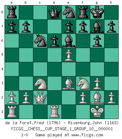 Last move : 1-0 2017 June 4 8:1:39 [Event "FICGS__CHESS__CUP_STAGE_1_GROUP_10__000001"] [Site "FICGS"] [Date "2017.03.01"] [Round "1"] [White "de la Foret,Fred"] [Black "Rivenburg,John"] [Result "1-0"] [WhiteElo "1796"] [BlackElo "1163"] 1.e4 c5 2.d4 cxd4 3.c3 dxc3 4.Nxc3 Nc6 5.Nf3 d6 6.g3 g6 7.Bg2 Nf6 8.O-O Bg7 9.Qc2 O-O 10.Rd1 Be6 11.e5 Ne8 12.Be3 1-0 This chess game has been lost on time (started : 2017.03.01 0:58:49) Sicilian : Smith-Morra gambit Kingside Castling by player White (move 8) Kingside Castling by player Black (move 9) Player White won this chess game. Follow this game move after move (download)Play the opening like a book, the middle game like a magician, and the endgame like a machine. (Spielmann) Karpov ist ein Museumsstück. (Garry Kasparov) El ganador de una partida es aquel jugador que hace el penúltimo error. (Savielly Tartakover) Il a essayé de se convaincre qu'il pourrait empêcher toutes les erreurs et ne jamais perdre. L'horreur ! Gary Kasparov au sujet de Robert Fischer. Tomorrow's what you make of it. (Horatio Caine, C.S.I. Miami)
