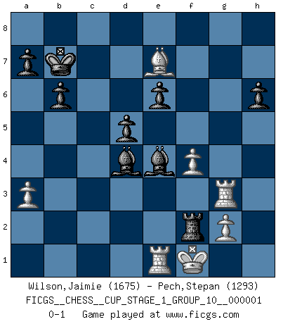 Last move : 0-1 2017 July 13 2:21:41 [Event "FICGS__CHESS__CUP_STAGE_1_GROUP_10__000001"] [Site "FICGS"] [Date "2017.03.01"] [Round "1"] [White "Wilson,Jaimie"] [Black "Pech,Stepan"] [Result "0-1"] [WhiteElo "1675"] [BlackElo "1293"] 1.e4 c6 2.Nf3 d5 3.Nc3 Nf6 4.e5 Ne4 5.Ne2 Qb6 6.d4 e6 7.Ng3 c5 8.c3 Bd7 9.Bd3 cxd4 10.Nxd4 Nxg3 11.hxg3 Bc5 12.Qg4 Nc6 13.Qxg7 O-O-O 14.Qf6 Nxd4 15.cxd4 Bxd4 16.O-O Kb8 17.Bg5 h6 18.Bh4 Qxb2 19.Rab1 Qc3 20.Rb3 Qc7 21.Rfb1 b6 22.Qf3 Rc8 23.Ba6 Qxe5 24.Bxc8 Rxc8 25.Qxf7 Be8 26.Qf4 Qxf4 27.gxf4 Ba4 28.Rg3 Bc2 29.Re1 Be4 30.Kf1 Kb7 31.Be7 Rc2 32.a3 Rxf2+ 0-1 Caro-Kann defense Queenside Castling by player Black (move 13) Kingside Castling by player White (move 16) Player Black won this chess game. Follow this game move after move (download)War is the child of passion, passion is the child of narcissism and narcissism is the child. (...) Another game ? (Thibault de Vassal) Ich bin der einzige Schachspieler, der sich während der Vorbereitungen zum Turnier verletzt hat. (Woody Allen) No hay un Gran Maestro de Ajedrez que sea normal; solo se diferencían ellos por la magnitud de su locura. (Viktor Korchnoi) La guerre est enfant de la passion, la passion est enfant du narcissisme et le narcissisme est l'enfant. (...) Une autre partie ? (Thibault de Vassal) Employ the attack like tactic of defense. (Chinese proverb)