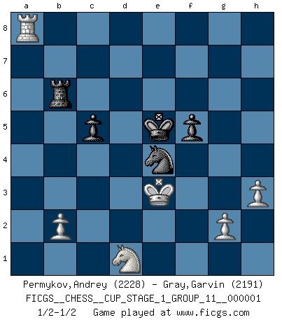 Last move : 1/2-1/2 2017 May 16 2:27:36 [Event "FICGS__CHESS__CUP_STAGE_1_GROUP_11__000001"] [Site "FICGS"] [Date "2017.03.01"] [Round "1"] [White "Permykov,Andrey"] [Black "Gray,Garvin"] [Result "1/2-1/2"] [WhiteElo "2228"] [BlackElo "2191"] 1.e4 e5 2.Nf3 Nc6 3.Bb5 a6 4.Ba4 Nf6 5.O-O b5 6.Bb3 Bb7 7.d3 Bc5 8.Nc3 O-O 9.a4 Na5 10.axb5 Nxb3 11.cxb3 d5 12.Bg5 axb5 13.Rxa8 Bxa8 14.Nxe5 Be7 15.Nxb5 h6 16.Bf4 dxe4 17.dxe4 Bxe4 18.Nc3 Bb7 19.Qxd8 Rxd8 20.Nc4 Ne8 21.Ra1 g5 22.Bg3 h5 23.h3 h4 24.Bh2 f6 25.Na5 Rb8 26.Rd1 Bb4 27.Nxb7 Rxb7 28.Rd3 Kf7 29.Nd5 Bf8 30.Rc3 c5 31.f4 Ke6 32.Ne3 Nd6 33.fxg5 Ne4 34.Rc4 Nxg5 35.Rxh4 Rxb3 36.Nd1 f5 37.Ra4 Bg7 38.Bf4 Bd4+ 39.Kf1 Ne4 40.Ra6+ Kf7 41.Ra3 Rb7 42.Ra2 Rb6 43.Ke2 Ke6 44.Be3 Bxe3 45.Kxe3 Ke5 46.Ra8 1/2-1/2 Ruy Lopez : Archangelsk (counterthrust) variation Kingside Castling by player White (move 5) Kingside Castling by player Black (move 8) This chess game ended in a draw. Follow this game move after move (download)All Chess players should have a hobby. (Savielly Tartakower) Schach verlangt totale Konzentration. (Robert James Fischer) No volvere nunca a jugar contigo. Has insultado a mi amigo. - cuando un oponente se maldijo por una mala jugada (Miguel Najdorf) Celui qui prend des risques peut perdre, celui qui n'en prend pas perd toujours. (Xavier Tartacover) If you are going through hell, keep going. (Winston Churchill)