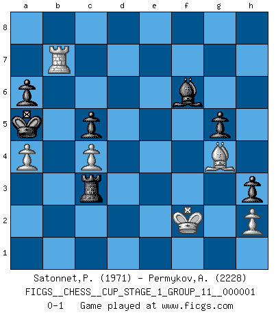 Last move : 0-1 2017 August 24 20:49:54 [Event "FICGS__CHESS__CUP_STAGE_1_GROUP_11__000001"] [Site "FICGS"] [Date "2017.03.01"] [Round "1"] [White "Satonnet,Patrick"] [Black "Permykov,Andrey"] [Result "0-1"] [WhiteElo "1971"] [BlackElo "2228"] 1.e4 c5 2.f4 d5 3.Nc3 d4 4.Nce2 Nc6 5.Nf3 Nf6 6.d3 Bg4 7.Ng3 h5 8.Be2 h4 9.Ne5 Bd7 10.Nxd7 Nxd7 11.Nf1 g5 12.fxg5 e6 13.g6 fxg6 14.Nd2 Nde5 15.Nf3 Nxf3+ 16.Bxf3 Bd6 17.O-O Qe7 18.Qd2 O-O-O 19.Qg5 Qd7 20.Be2 Rdg8 21.e5 Be7 22.Qg4 Rh5 23.Bd2 Rf5 24.Qe4 Rxe5 25.Qg4 Nb4 26.Rac1 Rf5 27.Qe4 Nd5 28.Rce1 Bd8 29.Bf3 Re8 30.c4 dxc3 31.bxc3 h3 32.g4 Rf6 33.c4 Nb4 34.a3 Nc6 35.Bc3 Nd4 36.Bd1 Ref8 37.Rxf6 Bxf6 38.Rf1 g5 39.Qe3 Qg7 40.Kh1 a6 41.a4 Rh8 42.Bf3 Qe7 43.Bxd4 Bxd4 44.Qe4 Qf7 45.Be2 Qh7 46.Qxe6+ Qd7 47.Qf5 Re8 48.Bf3 Qxf5 49.gxf5 Re3 50.Bh5 Kc7 51.Bg4 Bf6 52.Rd1 Kb6 53.Kg1 Ka5 54.Kf2 Bd4 55.f6 Re7 56.Kg3 Bxf6 57.Rb1 Re3+ 58.Kf2 Rxd3 59.Rxb7 Rc3 0-1 Sicilian : Grand Prix attack Kingside Castling by player White (move 17) Queenside Castling by player Black (move 18) Player Black won this chess game. Follow this game move after move (download)I have always a slight feeling of pity for the man who has no knowledge of Chess. (Siegbert Tarrasch) Dass jemand wie Surab Asmaiparaschwili, der selbst Elopunkte gekauft hat , Vize-Präsident der Fide werden konnte, sagt schon einges über den Zustand dieser Organisation aus. (Joel Lautier) Una buena memoria, concentración, imaginación y una fuerte voluntad, se requiere para llegar a ser un buen jugador. (Bobby Fischer) Le système Elo représente seulement une moyenne. Il est simplement un indicateur de votre stabilité. (Anatoli Karpov) Pretend inferiority and encourage his arrogance. (Sun Tzu)