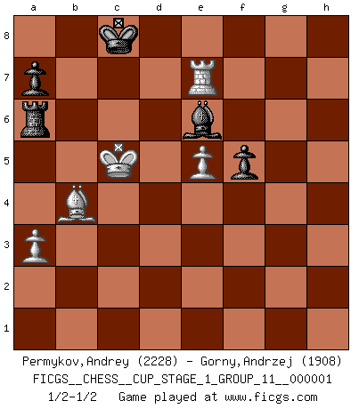 Last move : 1/2-1/2 2017 June 21 10:39:0 [Event "FICGS__CHESS__CUP_STAGE_1_GROUP_11__000001"] [Site "FICGS"] [Date "2017.03.01"] [Round "1"] [White "Permykov,Andrey"] [Black "Gorny,Andrzej"] [Result "1/2-1/2"] [WhiteElo "2228"] [BlackElo "1908"] 1.e4 e6 2.d4 d5 3.Nc3 Bb4 4.e5 c5 5.a3 Bxc3+ 6.bxc3 Ne7 7.Qg4 Qc7 8.Qxg7 Rg8 9.Qxh7 cxd4 10.Ne2 Nbc6 11.f4 Bd7 12.Qd3 dxc3 13.Qxc3 Nf5 14.Ng3 Nxg3 15.hxg3 Rc8 16.Rb1 Ne7 17.Qxc7 Rxc7 18.Bd3 Nf5 19.g4 Rxg4 20.Rh8+ Ke7 21.Bd2 Bc6 22.Bb4+ Kd7 23.Bxf5 exf5 24.Rf8 Rg7 25.c4 Rxg2 26.Rxf7+ Kd8 27.Ba5 b6 28.Rxb6 Rxf7 29.Rb2 Kc8 30.Rxg2 dxc4 31.Rg8+ Kb7 32.Kd2 Rh7 33.Kc3 Rh4 34.Kxc4 Rxf4+ 35.Kc5 Bd7 36.Rg7 Kc8 37.Bb4 Rf3 38.Kd5 Rd3+ 39.Kc4 Rd1 40.Rg6 Rc1+ 41.Kd4 Rd1+ 42.Ke3 Rd5 43.Bc3 Rc5 44.Kd4 Rc6 45.Rg7 Ra6 46.Bb4 Be6 47.Rh7 Ra4 48.Kc5 Ra6 49.Re7 1/2-1/2 French : Winawer, Advance, poisoned pawn variation 10 pieces endgame at move 34 : White KRBPP , Black KRBPP WHITE : King + 1 Rook 1 Bishop 2 Pawns BLACK : King + 1 Rook 1 Bishop 2 Pawns This chess game ended in a draw. Follow this game move after move (download)I love all positions. Give me a difficult positional game, I will play it. But totally won positions, I cannot stand them. (Hein Donner) Der Umstand, daß uns eine 7 Stunden Zeitkontrolle ermöglicht eine großartige, tiefe Partie zu spielen, ist für die Massenmedien nicht weiter von Bedeutung. (Alexej Shirov) Hay jugadores fuertes y personas amables y yo soy un jugador fuerte. (Bobby Fischer) Le temps de noter son nom sur la feuille de partie, j'étais déjà en zeitnot ! D'un modeste amateur apparié lors de la première ronde d'un open contre le grand-maître Azmaïparashvili. The real danger is not that computers will begin to think like men, but that men will begin to think like computers. (Sydney J. Harris)