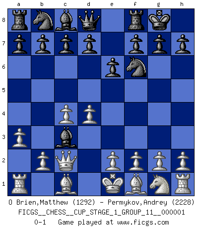 Last move : 0-1 2017 April 10 11:14:21 [Event "FICGS__CHESS__CUP_STAGE_1_GROUP_11__000001"] [Site "FICGS"] [Date "2017.03.01"] [Round "1"] [White "O Brien,Matthew"] [Black "Permykov,Andrey"] [Result "0-1"] [WhiteElo "1292"] [BlackElo "2228"] 1.d4 Nf6 2.c4 e6 3.Nc3 Bb4 4.Qc2 O-O 5.a3 Bxc3+ 0-1 This chess game has been lost on time (started : 2017.03.01 0:58:50) Nimzo-Indian : Classical variation Kingside Castling by player Black (move 4) Player Black won this chess game. Follow this game move after move (download)Chess is thirty to forty percent psychology. You don't have this when you play a computer. I can't confuse it. (Judith Polgar) Das Blackmar-Diemer-Gambit verändert den ganzen Menschen! (Emil Joseph Diemer) A la fecha, Fischer esta simplemente un nivel arriba de todos los mejores jugadores de Ajedrez del mundo. (John Jacobs) Pour moi, les échecs ne sont pas un jeu mais un art. (Alexandre Alekhine) Tree pose grows confidence. It roots me to this world. (Terri Guillemets)