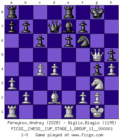 Last move : 1-0 2017 April 7 21:46:57 [Event "FICGS__CHESS__CUP_STAGE_1_GROUP_11__000001"] [Site "FICGS"] [Date "2017.03.01"] [Round "1"] [White "Permykov,Andrey"] [Black "Niglio,Biagio"] [Result "1-0"] [WhiteElo "2228"] [BlackElo "1195"] 1.e4 c6 2.d4 d5 3.Nc3 dxe4 4.Nxe4 Bf5 5.Ng3 Bg6 6.Nf3 Nd7 7.Bd3 Bxd3 8.Qxd3 Ngf6 9.Bf4 e6 10.O-O Be7 11.c4 O-O 12.a3 h6 13.Rfe1 g5 14.Bd2 Qc7 15.h4 g4 16.Ne5 h5 17.Nxd7 Qxd7 18.Qe3 Rfe8 19.Qg5+ 1-0 Caro-Kann : Classical variation Kingside Castling by player White (move 10) Kingside Castling by player Black (move 11) Player White won this chess game. Follow this game move after move (download)You need not play well - just help your opponent to play badly. (Genrikh Chepukaitis) Ich verstehe den Grund nicht, warum die Aufteilung in Frauen und Männer überhaupt im Schach besteht. (Judith Polgar) Por la belleza de sus partidas, la claridad de su juego y lo brillante de sus ideas, Fischer se creó el mismo como un artista de la misma estatura como Brahms, Rembrandt y Shakespeare. (David Levy) Les Echecs, c'est l'art de la guerre sans les charniers, c'est la résurrection des morts tombés au champ d'honneur, l'espoir perpétuel, la suprématie de l'intelligence sur la force, la culture de l'esprit. (F. Szpiner) Life is like internet, nothing interesting, but noone want to leave it. (Ilmars Cirulis)