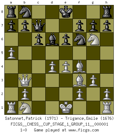 Last move : 1-0 2017 March 17 13:45:49 [Event "FICGS__CHESS__CUP_STAGE_1_GROUP_11__000001"] [Site "FICGS"] [Date "2017.03.01"] [Round "1"] [White "Satonnet,Patrick"] [Black "Trigance,Emile"] [Result "1-0"] [WhiteElo "1971"] [BlackElo "1676"] 1.Nf3 d5 2.g3 Nf6 3.Bg2 c6 4.c4 Bg4 5.Ne5 Bh5 6.cxd5 Nxd5 7.Qb3 Nb6 8.Bf3 Bg6 9.a4 Qc7 10.d4 e6 11.a5 Nd5 12.e4 Nf6 13.Bf4 Bd6 14.Nxg6 1-0 Reti : King's Indian attack (Barcza system) Player White won this chess game. Follow this game move after move (download)The stomach is an essential part of the Chess master. (Bent Larsen) Kein Großmeister ist normal. Sie unterscheiden sich nur im Ausmaß Ihrer Verrücktheit. (Viktor Kortschnoi) La táctica fluye a partir de una posición superior. (Bobby Fischer) Demandez au pauvre Cg1 ce qu'il en pense. Eduard Gufeld à propos de la variante Saemisch de l'Est-Indienne. Life is painting a picture, not doing a sum. (Oliver Wendell Holmes, Jr.)