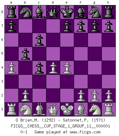 Last move : 0-1 2017 April 6 10:37:6 [Event "FICGS__CHESS__CUP_STAGE_1_GROUP_11__000001"] [Site "FICGS"] [Date "2017.03.01"] [Round "1"] [White "O Brien,Matthew"] [Black "Satonnet,Patrick"] [Result "0-1"] [WhiteElo "1292"] [BlackElo "1971"] 1.d4 d5 2.c4 dxc4 3.e4 b5 4.a4 c6 0-1 This chess game has been lost on time (started : 2017.03.01 0:58:50) QGA : 3.e4 Player Black won this chess game. Follow this game move after move (download)Chess is life. (Bobby Fischer) Je älter ich werde, um so mehr schätze ich die Bauern. (Paul Keres) Todos los Maestros de Ajedrez fueron un día unos principiantes. (Chernev) Les ravages du H expliquent la différence de niveau entre Tal et Thal [Abergel]. Tomorrow's what you make of it. (Horatio Caine, C.S.I. Miami)