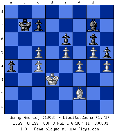 Last move : 1-0 2017 July 9 15:23:0 [Event "FICGS__CHESS__CUP_STAGE_1_GROUP_11__000001"] [Site "FICGS"] [Date "2017.03.01"] [Round "1"] [White "Gorny,Andrzej"] [Black "Lipsits,Sasha"] [Result "1-0"] [WhiteElo "1908"] [BlackElo "1773"] 1.e4 e5 2.Nf3 Nc6 3.Bb5 Nf6 4.O-O Nxe4 5.d4 Nd6 6.Bxc6 dxc6 7.dxe5 Nf5 8.Qxd8+ Kxd8 9.Rd1+ Ke8 10.Nc3 Be6 11.Ng5 Rd8 12.Rxd8+ Kxd8 13.Nxe6+ fxe6 14.Ne4 Be7 15.f4 h5 16.Kf2 Kc8 17.Be3 Rd8 18.g3 b6 19.h3 c5 20.g4 Nh4 21.Rg1 Rh8 22.Kg3 Kd7 23.Nd2 Bd8 24.b3 Be7 25.Rf1 Rf8 26.Rd1 Ke8 27.Ne4 Rh8 28.a4 Ng6 29.g5 a5 30.Rd3 Kf7 31.Rd7 Rc8 32.Kf2 Ke8 33.Rd2 Nh4 34.Ke2 Nf5 35.Bf2 Bf8 36.Ng3 Nxg3+ 37.Bxg3 g6 38.Be1 Be7 39.Kd3 Rb8 40.h4 Kd7 41.Kc4 Kc6 42.c3 Rf8 43.Bg3 Rc8 44.Be1 Rf8 45.Bg3 Rc8 46.Bf2 Rf8 47.Be3 Ra8 48.Kd3 Rd8+ 49.Kc2 c4 50.bxc4 Rxd2+ 51.Kxd2 Bf8 52.Bd4 Kb7 53.Bf2 Kc8 54.Be3 Kb7 55.Bd4 Kc6 56.Bg1 Ba3 57.Bd4 Bf8 58.Kd1 Kb7 59.Kc2 Kc6 60.Kd3 Bg7 61.c5 b5 62.axb5+ Kxb5 63.c4+ Kc6 64.Bc3 a4 65.Bd4 Kb7 66.Bf2 1-0 Ruy Lopez : Berlin defense, Open variation Kingside Castling by player White (move 4) Player White won this chess game. Follow this game move after move (download)The Pin is mightier than the sword. (Fred Reinfeld) Du musst Deinen Gegner in einen tiefen dunklen Wald führen wo 2+2=5 ist und wo der Weg, der wieder hinausführt, nur breit genug für einen ist. (Mikhail Nekhemyevich Tal) Tu puedes aprender mucho mas de una partida que pierdas que de una partida ganada. Tendras que perder cientos de partidas antes de llegar a ser un buen jugador. (Jose Raul Capablanca) La vie et les Echecs sont tous les deux une lutte constante. (Lasker) Good luck. You're gonna need it. (Han Solo in Star Wars ep.6)