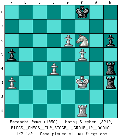 Last move : 1/2-1/2 2017 June 13 1:1:31 [Event "FICGS__CHESS__CUP_STAGE_1_GROUP_12__000001"] [Site "FICGS"] [Date "2017.03.01"] [Round "1"] [White "Pareschi,Remo"] [Black "Hamby,Stephen"] [Result "1/2-1/2"] [WhiteElo "1950"] [BlackElo "2212"] 1.d4 Nf6 2.c4 e6 3.Nc3 Bb4 4.Qc2 O-O 5.a3 Bxc3+ 6.Qxc3 b6 7.Bg5 Bb7 8.f3 h6 9.Bh4 d5 10.cxd5 exd5 11.Bxf6 Qxf6 12.Qxc7 Ba6 13.e3 Rc8 14.Qe5 Qxe5 15.dxe5 Bxf1 16.Kxf1 Rc2 17.b4 Nd7 18.f4 a5 19.bxa5 bxa5 20.Ne2 Rb8 21.Kf2 Nc5 22.Rad1 Ne4+ 23.Kf3 Nd2+ 24.Kg3 g5 25.Rhe1 Ne4+ 26.Kf3 g4+ 27.Kxg4 Nf2+ 28.Kf3 Nxd1 29.Rxd1 R8b2 30.Ng3 Rd2 31.Rf1 f6 32.e6 Rxg2 33.h4 Kf8 34.f5 Rh2 35.Nh5 Rh3+ 36.Kg4 Rbh2 37.Nxf6 Rxh4+ 38.Kf3 d4 39.exd4 R2h3+ 1/2-1/2 Nimzo-Indian : Classical variation Kingside Castling by player Black (move 4) This chess game ended in a draw. Follow this game move after move (download)The battle for the ultimate truth will never be won. And that's why Chess is so fascinating. (Hans Kmoch) Ich glaube, ich kenne inzwischen die Gründe für mein Versagen: schachliche Charakterfehler. Ich war nie ein Wunderkind und in meiner gesamten menschlichen Entwicklung immer zu langsam. (Viktor Kortschnoi) Si no le temes a Spassky, entonces elimino el elemento del dinero. (Jim Slater) Shah mat. Le roi est mort. Cri de fierté d'un joueur venant de terrasser son adversaire, courtoisement, sans effusion de sang. No, no, you're not thinking; you're just being logical. (Niels Bohr)
