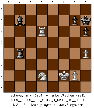 Last move : 1/2-1/2 2017 August 24 2:59:41 [Event "FICGS__CHESS__CUP_STAGE_1_GROUP_12__000001"] [Site "FICGS"] [Date "2017.03.01"] [Round "1"] [White "Pechova,Hana"] [Black "Hamby,Stephen"] [Result "1/2-1/2"] [WhiteElo "1234"] [BlackElo "2212"] 1.e4 e6 2.d4 d5 3.Nc3 Nf6 4.Bg5 Be7 5.e5 Nfd7 6.Bxe7 Qxe7 7.f4 a6 8.Nf3 c5 9.dxc5 Nc6 10.Qd2 Nxc5 11.Bd3 O-O 12.O-O b5 13.Qe3 h6 14.Ne2 Bd7 15.Nfd4 Nxd4 16.Nxd4 b4 17.Kh1 a5 18.Rf3 a4 19.Raf1 a3 20.b3 Rac8 21.Rg1 Nxd3 22.Qxd3 Rc3 23.Qd2 Rxf3 24.Nxf3 Be8 25.Rb1 f6 26.exf6 Qxf6 27.Qxb4 Qxf4 28.Qxa3 Qc7 29.Qa6 Qxc2 30.Re1 d4 31.Qxe6+ Bf7 32.Nxd4 Qd2 33.Qe3 Qxe3 34.Rxe3 Bxb3 35.h3 Bxa2 36.Kh2 Rf2 37.Kg3 Rd2 38.Nf3 Rb2 39.Rc3 Kh7 40.Rc5 Bb1 41.Rd5 Be4 42.Rd4 Bc6 43.Rd6 Bb7 44.Nh4 Rb3+ 45.Nf3 Rb1 46.Kf2 Rb5 47.h4 Rb2+ 48.Nd2 Rb4 1/2-1/2 French : Classical, Steinitz variation Kingside Castling by player Black (move 11) Kingside Castling by player White (move 12) 10 pieces endgame at move 35 : White KRNPP , Black KRBPP WHITE : King + 1 Rook 1 Knight 2 Pawns BLACK : King + 1 Rook 1 Bishop 2 Pawns This chess game ended in a draw. Follow this game move after move (download)Bobby is the finest Chess player this country ever produced. His memory for the moves, his brilliance in dreaming up combinations, and his fierce determination to win are uncanny. (John Collins) Ein Schachspiel besteht aus drei Phasen: Die erste, wenn du hofftst den Vorteil zu haben, die zweite, wenn du glaubst einen Vorteil zu haben, und die dritte.... wenn du weißt Du wirst verlieren. (Savielly Grigorievitsch Tartakower) El Ajedrez es tortura mental. (Garry Kasparov) La conception d'un plan est le processus par lequel un joueur exploite les avantages de sa position tout en s'efforçant d'en réduire au minimum les inconvénients. Afin de garantir le succès, un plan doit toujours se fonder sur un diagnostic objectif des particularités d'une position. La conception d'un plan est d'autant plus difficile que la position est équilibrée, et grandement facilitée lorsqu'il n'existe qu'un seul plan susceptible de répondre aux exigences de la position. (Harry Golombek) Computers make it easier to do a lot of things, but most of the things they make it easier to do don't need to be done. (Andy Rooney)