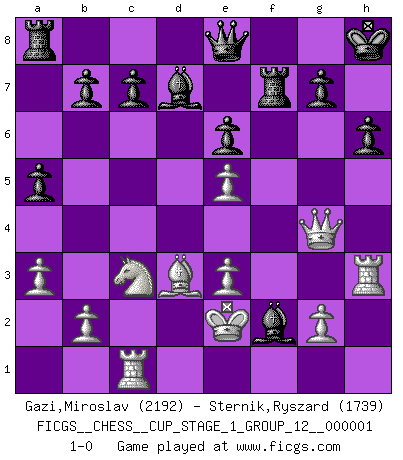 Last move : 1-0 2017 March 21 16:48:1 [Event "FICGS__CHESS__CUP_STAGE_1_GROUP_12__000001"] [Site "FICGS"] [Date "2017.03.01"] [Round "1"] [White "Gazi,Miroslav"] [Black "Sternik,Ryszard"] [Result "1-0"] [WhiteElo "2192"] [BlackElo "1739"] 1.d4 Nf6 2.c4 e6 3.Nf3 d5 4.Nc3 Nc6 5.Bg5 Be7 6.e3 O-O 7.Rc1 h6 8.Bh4 a5 9.a3 Ne4 10.Bg3 Nxg3 11.hxg3 dxc4 12.Bxc4 Bd7 13.g4 Kh8 14.Bd3 f5 15.Bb1 fxg4 16.Ne5 Nxe5 17.dxe5 Bh4 18.Qxg4 Bxf2+ 19.Ke2 Qe8 20.Bd3 Rf7 21.Rh3 1-0 Queen's pawn game Kingside Castling by player Black (move 6) Player White won this chess game. Follow this game move after move (download)A Chess game is divided into three stages: the first, when you hope you have the advantage, the second when you believe you have an advantage, and the third... when you know you're going to lose ! (Savielly Tartakower) Offener Brief an US-Präsident Bush anlässlich der Verhaftung Bobby Fishers: Verhaften Sie mich. Stecken Sie mich in dieselbe Zelle wie Bobby Fisher und geben Sie uns ein Schachspiel mit. (Boris Vassilievich Spassky) El jugador de combinación piensa hacia adelante; comienza de la posición dada y trabaja las movidas contundentes en su mente. (Emanuel Lasker) Toutes les manuvres exécutées sur une colonne ouverte ont pour but ultime l'intrusion définitive sur la septième ou la huitième rangée, en plein cur de la position ennemie. (Aaron Nimzovitch) A good player is always lucky. (Capablanca)