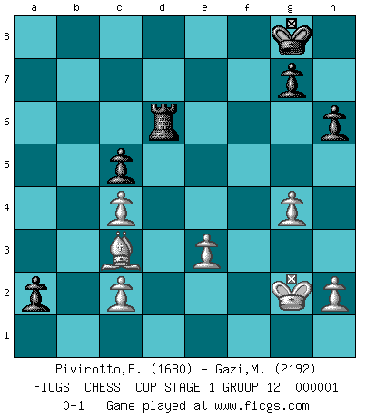 Last move : 0-1 2017 June 17 21:13:29 [Event "FICGS__CHESS__CUP_STAGE_1_GROUP_12__000001"] [Site "FICGS"] [Date "2017.03.01"] [Round "1"] [White "Pivirotto,Filiberto"] [Black "Gazi,Miroslav"] [Result "0-1"] [WhiteElo "1680"] [BlackElo "2192"] 1.b3 e5 2.Bb2 Nc6 3.e3 Nf6 4.Bb5 Bd6 5.Ne2 a6 6.Bxc6 dxc6 7.d3 Qe7 8.Nd2 Be6 9.Nc4 Bxc4 10.bxc4 b5 11.O-O bxc4 12.Ng3 O-O 13.dxc4 Rab8 14.Bc3 Qe6 15.Qe2 Bb4 16.Bb2 Nd7 17.Rab1 Be7 18.Ne4 Rb4 19.Nd2 Ra4 20.a3 e4 21.Qh5 f5 22.Bd4 Rxa3 23.Rb7 c5 24.Bb2 Ra2 25.Ra1 Rxa1+ 26.Bxa1 Qc6 27.Rb1 a5 28.g4 Qe6 29.Rb7 h6 30.Bc3 Bg5 31.Qh3 f4 32.Rxc7 a4 33.Ra7 fxe3 34.fxe3 Bf6 35.Ba5 Ne5 36.Qg2 Nc6 37.Ra6 Qc8 38.Rxc6 Qxc6 39.Qxe4 Qxe4 40.Nxe4 a3 41.Nxf6+ Rxf6 42.Bc3 a2 43.Kg2 Rd6 0-1 This chess game has been lost on time (started : 2017.03.01 0:58:52) Nimzovich-Larsen attack : Modern variation Kingside Castling by player White (move 11) Kingside Castling by player Black (move 12) Player Black won this chess game. Follow this game move after move (download)Good offense and good defense both begin with good development. (Bruce A. Moon) Im Fernschach kannst du während dem Spiel rauchen. (John Christen Knudsen) Diferente gente reacciona diferentemente en aceptar la derrota. (Bobby Fischer) Il n'y a pas de prix trop élevé au scalp de l'ennemi. (Koblentz) Perseverance does not equal worthiness. Next time you want to get my attention, wear something fun. Low-riding jeans are hot. (Gregory House, House M.D.)