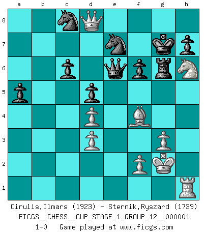 Last move : 1-0 2017 April 28 22:26:28 [Event "FICGS__CHESS__CUP_STAGE_1_GROUP_12__000001"] [Site "FICGS"] [Date "2017.03.01"] [Round "1"] [White "Cirulis,Ilmars"] [Black "Sternik,Ryszard"] [Result "1-0"] [WhiteElo "1923"] [BlackElo "1739"] 1.b4 d5 2.Nf3 e6 3.a3 a5 4.b5 Nf6 5.e3 Nbd7 6.c4 Nb6 7.cxd5 exd5 8.Bb2 Bf5 9.Nd4 Bg6 10.Be2 Bd6 11.O-O Nc4 12.Bc1 Be5 13.a4 Bxd4 14.exd4 Nd6 15.d3 O-O 16.Nd2 Re8 17.Re1 Re6 18.Nf3 Bh5 19.Bb2 Nd7 20.h3 f6 21.Nh4 Rxe2 22.Rxe2 Bxe2 23.Qxe2 Nb6 24.Qe6+ Kf8 25.Ba3 g6 26.g3 Qe7 27.Qg4 Rd8 28.Ng2 Kg7 29.Re1 Qd7 30.Qd1 Ndc8 31.h4 Re8 32.Ne3 Qf7 33.h5 gxh5 34.Kg2 Kh8 35.Rh1 Rg8 36.Rxh5 Nxa4 37.Qf3 Nab6 38.Nf5 Qe8 39.Nh6 Rg6 40.Qf4 c6 41.bxc6 bxc6 42.Rh1 Qe6 43.Bc1 Ne7 44.Qc7 Nbc8 45.Qd8+ Kg7 46.Bf4 1-0 Polish (Sokolsky) opening Kingside Castling by player White (move 11) Kingside Castling by player Black (move 15) Player White won this chess game. Follow this game move after move (download)The tactician must know what to do whenever something needs doing; the strategist must know what to do when nothing needs doing. (Savielly Tartakover) Oft bringt ein stiller Zug das Erdbeben. (Richard Reti) Entre mas años cumplo, mas valoro los Peones. (Keres) Soyez une menace à chaque fois que vous vous asseyez pour jouer. (Ken Smith) Shallow men believe in luck. Strong men belive in cause and effect. (Ralph Waldo Emerson)