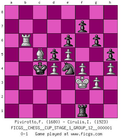Last move : 0-1 2017 July 3 21:53:59 [Event "FICGS__CHESS__CUP_STAGE_1_GROUP_12__000001"] [Site "FICGS"] [Date "2017.03.01"] [Round "1"] [White "Pivirotto,Filiberto"] [Black "Cirulis,Ilmars"] [Result "0-1"] [WhiteElo "1680"] [BlackElo "1923"] 1.e4 e6 2.d4 d5 3.Nc3 Bb4 4.e5 Ne7 5.a3 Bxc3+ 6.bxc3 b6 7.Qg4 Ng6 8.h4 h5 9.Qg3 Ba6 10.Bxa6 Nxa6 11.Ne2 Qd7 12.a4 Nb8 13.Nf4 Nxf4 14.Bxf4 g6 15.Bg5 Nc6 16.Bf6 Rh7 17.O-O Na5 18.f3 Rc8 19.Rf2 c5 20.f4 Kf8 21.Qd3 Nc4 22.g3 Ke8 23.R2f1 Qc6 24.Rfb1 Na5 25.Qa6 Rc7 26.Qb5 cxd4 27.cxd4 Qxb5 28.axb5 Rc3 29.Kg2 Rxc2+ 30.Kh3 Kd7 31.Rc1 Rb2 32.Rcb1 Rxb1 33.Rxb1 Kc8 34.Kg2 Nc4 35.Rc1 Kb7 36.Ra1 Nd2 37.Rc1 a6 38.bxa6+ Kxa6 39.Rd1 Ne4 40.Be7 Rh8 41.Rc1 Kb5 42.Kf3 Ra8 43.Rb1+ Kc4 44.Rxb6 Ra1 45.Bc5 Rf1+ 0-1 French : Winawer, Advance variation Kingside Castling by player White (move 17) Player Black won this chess game. Follow this game move after move (download)Though most people love to look at the games of the great attacking masters, some of the most successful players in history have been the quiet positional players. They slowly grind you down by taking away your space, tying up your pieces, and leaving you with virtually nothing to do ! (Yasser Seirawan) Ein Buch ist ein Spiegel; wenn ein Affe hineinsieht, so kann kein Apostel heraus gucken. (Georg Christoph Lichtenberg) Cada Peón es una Reina en potencia. (James Mason) Vous savez, camarade Pachman, je n'éprouve pas de plaisir à être ministre, je jouerais plutôt aux échecs comme vous, ou alors ferais une révolution au Venezuela. (Che Guevara à Ludek Pachman, 'Checkmate in Prague', 1975) I teach you to lie, cheat and steal, and as soon as my back's turned you wait in line ? (Gregory House, House M.D.)
