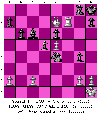 Last move : 1-0 2017 May 10 19:38:1 [Event "FICGS__CHESS__CUP_STAGE_1_GROUP_12__000001"] [Site "FICGS"] [Date "2017.03.01"] [Round "1"] [White "Sternik,Ryszard"] [Black "Pivirotto,Filiberto"] [Result "1-0"] [WhiteElo "1739"] [BlackElo "1680"] 1.Nf3 Nf6 2.Nc3 d5 3.d4 e6 4.Bg5 Be7 5.e3 O-O 6.Bd3 Nbd7 7.O-O c5 8.Ne5 Nxe5 9.dxe5 Nd7 10.Bxe7 Qxe7 11.f4 c4 12.Be2 f6 13.exf6 Nxf6 14.Qd4 b6 15.e4 Bb7 16.e5 Nd7 17.Nb5 Nc5 18.Qe3 Qf7 19.Nd6 Qd7 20.Rad1 g6 21.Nxc4 Qb5 22.Nd6 Qxb2 23.f5 gxf5 24.Rd4 Bc6 25.Qg5+ Kh8 26.Rg4 fxg4 27.Nf7+ Rxf7 28.Rxf7 Qd4+ 29.Kh1 Qa1+ 30.Bf1 Qxf1+ 31.Rxf1 Ne4 32.Qe7 Rg8 33.Rf7 1-0 Reti Opening Kingside Castling by player Black (move 5) Kingside Castling by player White (move 7) Player White won this chess game. Follow this game move after move (download)The game of chess is the touchstone of the intellect. (Goethe) Wenn Spassky eine Figur opfert kannst du genauso gut aufgeben. Aber wenn Tal eine Figur opfert, spiel weiter. Er könnte noch eine weitere opfern, und dann ... wer weiß? (Miguel Najdorf) El Ajedrez hace al hombre ser mas sabio y ver mas claro. (Vladimir Putin) La vie est comme un jeu d'échecs : nous esquissons un plan, mais celui-ci est tributaire de ce que daignent faire l'adversaire aux échecs et le destin dans la vie. (Arthur Schopenhauer) Control your own destiny or someone else will. (Jack Welch)