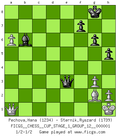 Last move : 1/2-1/2 2017 June 6 12:36:0 [Event "FICGS__CHESS__CUP_STAGE_1_GROUP_12__000001"] [Site "FICGS"] [Date "2017.03.01"] [Round "1"] [White "Pechova,Hana"] [Black "Sternik,Ryszard"] [Result "1/2-1/2"] [WhiteElo "1234"] [BlackElo "1739"] 1.e4 c5 2.Nf3 d6 3.d4 cxd4 4.Nxd4 Nf6 5.Nc3 a6 6.Be3 e5 7.Nb3 Be6 8.Be2 Be7 9.O-O O-O 10.Qd2 Nbd7 11.a4 Rc8 12.a5 Qc7 13.Rfd1 Nc5 14.Nxc5 dxc5 15.Qe1 Rfd8 16.Rxd8+ Qxd8 17.Bg5 c4 18.Bxf6 Bxf6 19.Nd5 Bxd5 20.Rd1 Rc5 21.exd5 Rxd5 22.Rxd5 Qxd5 23.Qb4 g6 24.Bxc4 Qd1+ 25.Bf1 Qxc2 26.Qxb7 Qd2 27.b4 e4 28.Qxa6 Bd4 29.Qe2 Qxb4 30.a6 Kg7 31.g3 Bb6 32.Qd1 e3 33.fxe3 Qe4 34.Qa1+ Kg8 35.Bg2 Qxe3+ 36.Kh1 h5 1/2-1/2 Sicilian : Najdorf, Byrne (English) attack Kingside Castling by player White (move 9) Kingside Castling by player Black (move 9) This chess game ended in a draw. Follow this game move after move (download)Not all artists are Chess players, but all Chess players are artists. (Marcel Duchamp) Sicherlich können nur Meister einen Stil haben. Daß ein nicht-Meister auch nur ein einziges Mal in seinem Leben eine Partie folgerecht durchführte, habe ich niemals bemerkt. (Emanuel Lasker) Ciertamente, de todas la drogas del mundo, el Ajedrez debe ser el mas placentero permamentemente. (Assiac) Aidez vos pièces, elles vous aideront. (Paul Morphy) If you are going through hell, keep going. (Winston Churchill)