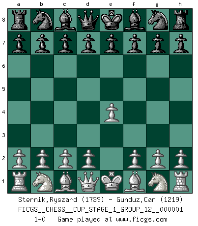Last move : 1-0 2017 March 31 22:15:39 [Event "FICGS__CHESS__CUP_STAGE_1_GROUP_12__000001"] [Site "FICGS"] [Date "2017.03.01"] [Round "1"] [White "Sternik,Ryszard"] [Black "Gunduz,Can"] [Result "1-0"] [WhiteElo "1739"] [BlackElo "1219"] 1.e4 1-0 This chess game has been lost on time (started : 2017.03.01 0:58:52) King's pawn Opening Player White won this chess game. Follow this game move after move (download)Everything is in a state of flux, and this includes the world of Chess. (Mikhail Botvinnik) Ich spiele 70 Eröffnungssysteme. (Viktor Kortschnoi) El jugador de combinación piensa hacia adelante; comienza de la posición dada y trabaja las movidas contundentes en su mente. (Emanuel Lasker) Les pièces de l'échiquier étaient impitoyables. Elles le retenaient, elles l'absorbaient. Il y avait de l'horreur en cela, mais aussi une harmonie unique. Car, qu'y a-t-il dans le monde, à part les échecs ? (V. Nabokov) Either move or be moved. (Ezra Pound)