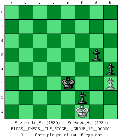 Last move : 0-1 2017 September 13 19:37:39 [Event "FICGS__CHESS__CUP_STAGE_1_GROUP_12__000001"] [Site "FICGS"] [Date "2017.03.01"] [Round "1"] [White "Pivirotto,Filiberto"] [Black "Pechova,Hana"] [Result "0-1"] [WhiteElo "1680"] [BlackElo "1234"] 1.e4 e5 2.Nf3 Nc6 3.Bb5 a6 4.Ba4 Nf6 5.O-O Be7 6.Re1 b5 7.Bb3 d6 8.c3 O-O 9.h3 Re8 10.d4 Bb7 11.Nbd2 Bf8 12.a4 h6 13.d5 Nb8 14.axb5 axb5 15.Rxa8 Bxa8 16.Nf1 c6 17.dxc6 Bxc6 18.Ng3 Nbd7 19.Nh2 Nc5 20.Bc2 d5 21.Nf3 Qa8 22.exd5 Bxd5 23.Nf5 Bb7 24.Rxe5 Rxe5 25.Nxe5 Bxg2 26.Kh2 Be4 27.f4 Nfd7 28.Nxd7 Nxd7 29.Be3 Nf6 30.Bd4 Bxc2 31.Qxc2 Nh5 32.Be3 g6 33.Ng3 Qf3 34.Nxh5 Qxe3 35.Nf6+ Kg7 36.Nd5 Qf3 37.Qg2 Qd3 38.Nc7 Bc5 39.Qd5 Qc2+ 40.Qg2 Qf5 41.Qd2 Qb1 42.Qg2 Qe1 43.Nd5 Be3 44.Nxe3 Qxe3 45.Qg3 Qd2+ 46.Qg2 Qxf4+ 47.Qg3 Qxg3+ 48.Kxg3 f5 49.b3 Kf6 50.Kf3 g5 51.c4 bxc4 52.bxc4 Ke5 53.c5 Kd5 54.c6 Kxc6 55.Kf2 Kd5 56.Ke3 f4+ 57.Kf3 Ke5 58.Ke2 Ke4 59.Kf2 f3 60.Kg3 h5 61.Kf2 h4 62.Ke1 Ke3 63.Kf1 f2 0-1 Ruy Lopez : Closed Kingside Castling by player White (move 5) Kingside Castling by player Black (move 8) 10 pieces endgame at move 47 : White KPPP , Black KQPPPP WHITE : King + 3 Pawns BLACK : King + 1 Queen 4 Pawns 9 pieces endgame at move 48 : White KPPP , Black KPPPP WHITE : King + 3 Pawns BLACK : King + 4 Pawns 8 pieces endgame at move 51 : White KPP , Black KPPPP WHITE : King + 2 Pawns BLACK : King + 4 Pawns 7 pieces endgame at move 52 : White KPP , Black KPPP WHITE : King + 2 Pawns BLACK : King + 3 Pawns 6 pieces endgame at move 54 : White KP , Black KPPP WHITE : King + 1 Pawn BLACK : King + 3 Pawns Player Black won this chess game. Follow this game move after move (download)Combinations have always been the most intriguing aspect of Chess. The masters look for them, the public applauds them, the critics praise them. It is because combinations are possible that Chess is more than a lifeless mathematical exercise. They are the poetry of the game; they are to Chess what melody is to music. They represent the triumph of mind over matter. (Reuben Fine) Gegen einen Schachcomputer zu verlieren ist wie Löcher in den Strümpfen zuhaben. Es ist nicht peinlich, solange man der einzige ist der es weiß. (Anonymous) El Ajedrez es tan interesante por sí solo, que no es necesario un interés monetario para persuadir a una persona a que lo practique; por lo tanto, nunca se juega por dinero. (Benjamin Franklin) Mais n'est-ce pas déjà le limiter injurieusement que d'appeler les échecs un jeu? N'est-ce pas aussi une science, un art, ou quelque chose qui, comme le cercueil de Mahomet entre ciel et terre, est suspendu entre l'un et l'autre, et qui réunit un nombre incroyable de contraires ? (Stefan Zweig) In God we trust, all others we virus scan. (Anonymous)