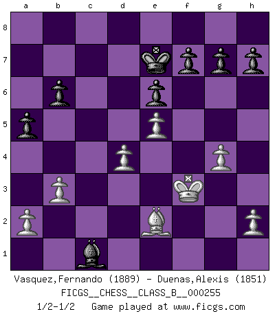Last move : 1/2-1/2 2017 June 24 18:36:47 [Event "FICGS__CHESS__CLASS_B__000255"] [Site "FICGS"] [Date "2017.03.03"] [Round "1"] [White "Vasquez,Fernando"] [Black "Duenas,Alexis"] [Result "1/2-1/2"] [WhiteElo "1889"] [BlackElo "1851"] 1.e4 c5 2.c3 d5 3.exd5 Qxd5 4.d4 e6 5.Nf3 Nf6 6.Be2 Be7 7.O-O O-O 8.Be3 cxd4 9.cxd4 Nc6 10.Nc3 Qd6 11.Rc1 b6 12.Nb5 Qd7 13.Ne5 Nxe5 14.dxe5 Nd5 15.Nc7 Nxe3 16.fxe3 Rb8 17.Na6 Qxd1 18.Rcxd1 Bxa6 19.Bxa6 Rfd8 20.Kf2 Rxd1 21.Rxd1 Rd8 22.Rd4 Rxd4 23.exd4 Bg5 24.Be2 Kf8 25.g4 Bc1 26.b3 Ke7 27.Kf3 a5 1/2-1/2 Sicilian : Alapin's variation (2.c3) Kingside Castling by player White (move 7) Kingside Castling by player Black (move 7) This chess game ended in a draw. Follow this game move after move (download)Capture of the adverse King is the ultimate but not the first object of the game. (William Steinitz) Jede Eröffnung ist gut genug um gespielt zu werden, wenn nur ihr Ruf schlecht genug ist. (Savielly Grigorievitsch Tartakower) La vida es como un juego de Ajedrez, cambiando con cada movimiento. (Proverbio Chino) Les Echecs sont affaire de jugement sensible. Savoir quand frapper et quand esquiver. (Fischer) Yoga is 99% practice and 1% knowledge. (Sri Krishna Pattabhi Jois)