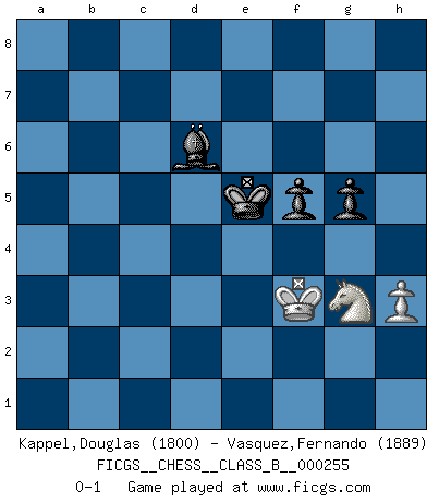 Last move : 0-1 2018 January 23 0:0:10 [Event "FICGS__CHESS__CLASS_B__000255"] [Site "FICGS"] [Date "2017.03.03"] [Round "1"] [White "Kappel,Douglas"] [Black "Vasquez,Fernando"] [Result "0-1"] [WhiteElo "1800"] [BlackElo "1889"] 1.Nf3 Nf6 2.c4 e6 3.g3 d5 4.Bg2 Be7 5.cxd5 exd5 6.d4 O-O 7.O-O c6 8.Nc3 Nbd7 9.a3 Re8 10.Qc2 Nb6 11.b4 Nc4 12.Rd1 Nd6 13.Ne5 Bf5 14.Qb3 Nfe4 15.Nxe4 dxe4 16.Qb2 Be6 17.f3 f6 18.Ng4 a5 19.bxa5 Qxa5 20.Nf2 exf3 21.Bxf3 Qb5 22.d5 Bxd5 23.Qxb5 Nxb5 24.Bxd5+ cxd5 25.Rxd5 Nc3 26.Rd7 Nxe2+ 27.Kf1 Nxc1 28.Rxc1 b6 29.Rc6 Rxa3 30.Re6 Kf7 31.Rxb6 Rd8 32.Rxd8 Bxd8 33.Rb7+ Be7 34.Ke2 g6 35.g4 Ra5 36.h3 h5 37.Nd3 Ra2+ 38.Kf3 Ra3 39.Ke4 Ra4+ 40.Kf3 g5 41.gxh5 Rh4 42.Kg3 Ke6 43.Rb6+ Bd6+ 44.Kg2 Rxh5 45.Nf2 Rh4 46.Ng4 f5 47.Ne3 Rb4 48.Rxb4 Bxb4 49.Kf3 Bd2 50.Nf1 Bc1 51.Ng3 Ba3 52.Ne2 Bb2 53.Ng3 Kf6 54.Nf1 Bc1 55.Ng3 Ke6 56.Nf1 Ke5 57.Ng3 Bd2 58.Nh5 Bb4 59.Ng3 Bd6 0-1 Reti Opening Kingside Castling by player Black (move 6) Kingside Castling by player White (move 7) 10 pieces endgame at move 41 : White KRNPP , Black KRBPP WHITE : King + 1 Rook 1 Knight 2 Pawns BLACK : King + 1 Rook 1 Bishop 2 Pawns 9 pieces endgame at move 44 : White KRNP , Black KRBPP WHITE : King + 1 Rook 1 Knight 1 Pawn BLACK : King + 1 Rook 1 Bishop 2 Pawns 8 pieces endgame at move 48 : White KRNP , Black KBPP WHITE : King + 1 Rook 1 Knight 1 Pawn BLACK : King + 1 Bishop 2 Pawns 7 pieces endgame at move 48 : White KNP , Black KBPP WHITE : King + 1 Knight 1 Pawn BLACK : King + 1 Bishop 2 Pawns Player Black won this chess game. Follow this game move after move (download)Chess is the gymnasium of the mind. (Blaise Pascal) Ich bin stolz ein Bulgare zu sein. (Veselin Topalov) Uno no tiene que jugar muy bien, es suficiente jugar mejor que el oponente. (Siegbert Tarrasch) Un footballeur joue avec ses pieds, parfois avec sa tête. Un joueur d'échecs ne joue qu'avec sa tête. Et quand il ne joue plus, il meurt. (Jacob Murray) Perhaps the current trend of many chess professionals taking up the more lucrative pastime of poker is not a wholly negative one. It may not be too late for humans to relearn how to take risks in order to innovate and thereby maintain the advanced lifestyles we enjoy. And if it takes a poker-playing supercomputer to remind us that we can't enjoy the rewards without taking the risks, so be it. (The Chess Master and the Computer, by Garry Kasparov - 2010)