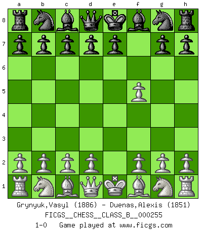 Last move : 1-0 2017 March 3 15:58:27 [Event "FICGS__CHESS__CLASS_B__000255"] [Site "FICGS"] [Date "2017.03.03"] [Round "1"] [White "Grynyuk,Vasyl"] [Black "Duenas,Alexis"] [Result "1-0"] [WhiteElo "1886"] [BlackElo "1851"] 1.e4 f5 2.exf5 1-0 Fred Player White won this chess game. Follow this game move after move (download)When in doubt... play Chess ! (Tevis) Gewinnen beim Schach fördert das Selbstvertrauen. Beim Sex spüre ich sowas nicht... (Garry Kasparov) Un jugador que trata de regresar una movida en el Ajedrez es un futuro carterista. (Richard Fenton) La vérité est comme le meilleur coup aux échecs : elle existe, mais il faut la chercher. (Arturo Perez-Reverte) Dave, my mind is going. I can feel it. (HAL 9000 in 2001, a space odyssey)