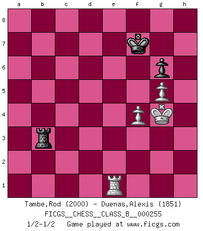 Last move : 1/2-1/2 2017 March 23 23:6:53 [Event "FICGS__CHESS__CLASS_B__000255"] [Site "FICGS"] [Date "2017.03.03"] [Round "1"] [White "Tambe,Rod"] [Black "Duenas,Alexis"] [Result "1/2-1/2"] [WhiteElo "2000"] [BlackElo "1851"] 1.d4 Nf6 2.c4 e6 3.Nc3 Bb4 4.Nf3 c5 5.e3 O-O 6.Bd3 d5 7.O-O dxc4 8.Bxc4 Nbd7 9.Qe2 b6 10.a3 Bxc3 11.bxc3 Bb7 12.Nd2 e5 13.Bb2 Re8 14.a4 Rc8 15.Rfc1 Qc7 16.Bb5 Bc6 17.f3 Qd6 18.Bc4 Bb7 19.e4 cxd4 20.cxd4 exd4 21.Qd3 Ne5 22.Qxd4 Qxd4+ 23.Bxd4 Nxc4 24.Nxc4 Re6 25.Na3 Rxc1+ 26.Rxc1 Bc6 27.Nb5 Bxb5 28.axb5 Ne8 29.Bb2 f6 30.Ba3 f5 31.exf5 Re5 32.Rc8 Kf7 33.Ra8 Rxf5 34.Rxa7+ Kg8 35.Re7 Nf6 36.Bb2 Rxb5 37.Bd4 Rb4 38.Bc3 Rb3 39.Be5 h5 40.h4 Kf8 41.Rb7 Rb5 42.Bd6+ Kg8 43.Kf2 g6 44.Bf4 Rf5 45.Kg3 b5 46.Bh6 Ne8 47.Re7 Nf6 48.Rg7+ Kh8 49.Rb7 Kg8 50.Kh2 Kh8 51.Bg5 Kg8 52.Kg1 Ne8 53.Kf2 Rc5 54.Rb6 Kf7 55.Ke3 Nc7 56.Ke4 Rc2 57.g3 Ne6 58.Rb7+ Rc7 59.Rxb5 Nxg5+ 60.hxg5 Re7+ 61.Re5 Ra7 62.Ke3 Ra2 63.f4 Rh2 64.Kf3 h4 65.gxh4 Rxh4 66.Re1 Rh3+ 67.Ke4 Rb3 68.Ke5 Rb5+ 69.Ke4 Rb4+ 70.Kf3 Rb3+ 71.Kg4 Rb4 72.Rc1 Rb7 73.Re1 Rb3 74.Rc1 Rb7 75.Re1 Rb3 1/2-1/2 Nimzo-Indian : Three knights variation Kingside Castling by player Black (move 5) Kingside Castling by player White (move 7) 10 pieces endgame at move 59 : White KRPPP , Black KRNPP WHITE : King + 1 Rook 3 Pawns BLACK : King + 1 Rook 1 Knight 2 Pawns 9 pieces endgame at move 60 : White KRPPP , Black KRPP WHITE : King + 1 Rook 3 Pawns BLACK : King + 1 Rook 2 Pawns 8 pieces endgame at move 65 : White KRPPP , Black KRP WHITE : King + 1 Rook 3 Pawns BLACK : King + 1 Rook 1 Pawn 7 pieces endgame at move 65 : White KRPP , Black KRP WHITE : King + 1 Rook 2 Pawns BLACK : King + 1 Rook 1 Pawn This chess game ended in a draw. Follow this game move after move (download)By the beauty of his games, the clarity of his play, and the brilliance of his ideas, Fischer made himself an artist of the same stature as Brahms, Rembrandt, and Shakespeare. (David Levy) Stelle das Brett so, daß die Sonne in die Augen deines Gegners scheint. (Ruy López) Yo siempre he tenido un ligero sentimiento de lástima por una persona que no tiene conocimiento del Ajedrez. (Siegbert Tarrasch) En blitz, le Cavalier l'emporte sur le Fou. (Vlastimil Hort) CHESS, n. f. [echecs, Fr.] A nice and abstruse game, in which two sets of puppets are moved in opposition to each other. (Dr Samuel Johnson, A Dictionary Of The English Language, 1755)