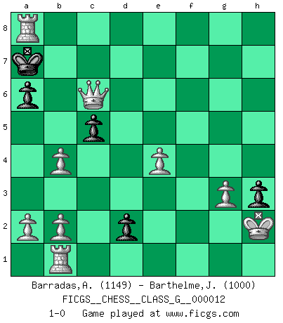 Last move : 1-0 2007 April 19 19:41:0 [Event "FICGS__CHESS__CLASS_G__000012"] [Site "FICGS"] [Date "2007.04.04"] [Round "1"] [White "Barradas,Anderson"] [Black "Barthelme,Jean Eudes"] [Result "1-0"] [WhiteElo "1149"] [BlackElo "1000"] 1.e4 e5 2.Nf3 Nc6 3.Bb5 a6 4.Ba4 Nf6 5.d3 b5 6.Bb3 Bc5 7.c3 Qe7 8.Bg5 h6 9.Bh4 g5 10.Bg3 Ng4 11.d4 exd4 12.Nbd2 d3 13.O-O h5 14.Bxc7 d6 15.h3 Nge5 16.Nxe5 Nxe5 17.Ba5 g4 18.Bd5 Bb7 19.Bxb7 Qxb7 20.Bb4 gxh3 21.Bxc5 dxc5 22.g3 b4 23.Rb1 h4 24.Kh2 Qd7 25.Nf3 Qe6 26.Nxe5 Qxe5 27.Qg4 hxg3+ 28.fxg3 d2 29.cxb4 f5 30.Rxf5 Qd4 31.Qg6+ Kd8 32.Rd5+ Kc8 33.Rxd4 Rd8 34.Qc6+ Kb8 35.Rxd8+ Ka7 36.Rxa8+ 1-0 Ruy Lopez : Anderssen variation Kingside Castling by player White (move 13) Player White won this chess game. Follow this game move after move (download)Some sacrifices are sound; the rest are mine. (Mikhail Tal) Woher wissen wir, daß der Neanderthaler Blindschach gespielt hat? -- Bei Ausgrabungen wurden keine Schachbretter und Figuren gefunden. (Anonymous) Los Peones son nacidos libres, y aún así, se encuentran encadenados por todos lados. (Rick Kennedy) Mon pion favori sur ma case favorite ! Bronstein en parlant d'un coup de pion en h5 quand il avait les Noirs. A journey of a thousand sites begins with a single click. (Author unknown)