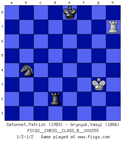 Last move : 1/2-1/2 2017 July 30 20:44:6 [Event "FICGS__CHESS__CLASS_B__000255"] [Site "FICGS"] [Date "2017.03.03"] [Round "1"] [White "Satonnet,Patrick"] [Black "Grynyuk,Vasyl"] [Result "1/2-1/2"] [WhiteElo "1983"] [BlackElo "1886"] 1.Nf3 d5 2.g3 Nf6 3.Bg2 c6 4.c4 Bf5 5.cxd5 cxd5 6.Qb3 Qb6 7.Qxb6 axb6 8.Nc3 Nc6 9.d3 e6 10.O-O Be7 11.Nh4 Bg4 12.h3 Bh5 13.g4 Bg6 14.a3 Nd4 15.Bf4 O-O 16.e3 Nb3 17.Rad1 Rfc8 18.Bg5 Rd8 19.Rfe1 Kf8 20.e4 d4 21.Na2 h6 22.e5 Nd5 23.Bxe7+ Kxe7 24.Bxd5 Rxd5 25.f4 Rb5 26.Re2 Na5 27.Kf2 Bh7 28.Nc1 Nc6 29.Nf3 Bg6 30.Kg3 Ra4 31.Rf1 Rd5 32.Nh4 Bh7 33.Nf3 b5 34.h4 b4 35.axb4 Nxb4 36.Rd2 Ra1 37.Re1 Rd8 38.Nb3 Rxe1 39.Nxe1 Rd5 40.h5 f5 41.exf6+ gxf6 42.Nf3 e5 43.fxe5 fxe5 44.g5 hxg5 45.Nxg5 Bxd3 46.Rf2 e4 47.Rf7+ Kd6 48.Rf6+ Kd7 49.Rf7+ Ke8 50.Rg7 e3 51.h6 Bf5 52.Nf3 d3 53.Rxb7 Nc6 54.h7 Bxh7 55.Rxh7 d2 56.Nbxd2 exd2 57.Nxd2 Rxd2 58.b4 Nxb4 1/2-1/2 Reti : King's Indian attack (Barcza system) Kingside Castling by player White (move 10) Kingside Castling by player Black (move 15) 10 pieces endgame at move 55 : White KRNNP , Black KRNPP WHITE : King + 1 Rook 2 Knights 1 Pawn BLACK : King + 1 Rook 1 Knight 2 Pawns 9 pieces endgame at move 56 : White KRNNP , Black KRNP WHITE : King + 1 Rook 2 Knights 1 Pawn BLACK : King + 1 Rook 1 Knight 1 Pawn 8 pieces endgame at move 56 : White KRNP , Black KRNP WHITE : King + 1 Rook 1 Knight 1 Pawn BLACK : King + 1 Rook 1 Knight 1 Pawn 7 pieces endgame at move 57 : White KRNP , Black KRN WHITE : King + 1 Rook 1 Knight 1 Pawn BLACK : King + 1 Rook 1 Knight 6 pieces endgame at move 57 : White KRP , Black KRN WHITE : King + 1 Rook 1 Pawn BLACK : King + 1 Rook 1 Knight 5 pieces endgame at move 58 : White KR , Black KRN WHITE : King + 1 Rook BLACK : King + 1 Rook 1 Knight This chess game ended in a draw. Follow this game move after move (download)I have added these principles to the law: get the Knights into action before both Bishops are developed. (Emanuel Lasker) Ich verachte die Medien. (Robert James Fischer) Una partida de Ajedrez se divide en 3 etapas: la primera cuando piensas que tienes la ventaja, la segunda cuando crees que tienes la ventaja y la tercera... ¡cuando te das cuenta que vas a perder!. (Savielly Tartakower) Aux échecs, l'amour-propre est satisfait quand on remporte la victoire, mais il n'y a pas de honte à être battu. (Benjamin Franklin) Good decisions come from experience, and experience comes from bad decisions. (Anonymous)