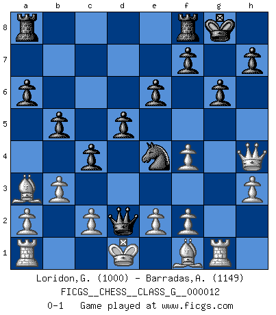 Last move : 0-1 2007 April 11 17:59:49 [Event "FICGS__CHESS__CLASS_G__000012"] [Site "FICGS"] [Date "2007.04.04"] [Round "1"] [White "Loridon,Geoffroy"] [Black "Barradas,Anderson"] [Result "0-1"] [WhiteElo "1000"] [BlackElo "1149"] 1.d4 d5 2.Nc3 Nf6 3.Nf3 Bg4 4.h3 Bxf3 5.gxf3 Nc6 6.f4 e6 7.Nb5 a6 8.Na3 Nxd4 9.Qxd4 c5 10.Qa4+ b5 11.Qb3 c4 12.Qf3 Bd6 13.b3 O-O 14.Rg1 Bb4+ 15.Kd1 Qa5 16.Qg3 g6 17.Bb2 Ne4 18.Qh4 Bxa3 19.Bxa3 Qd2+ 0-1 Queen's pawn : Chigorin variation Kingside Castling by player Black (move 13) Player Black won this chess game. Follow this game move after move (download)I like the moment when I break a man's ego. (Bobby Fischer) Wenn Du nicht kämpfst, um anderen etwas zu beweisen, sondern nur für Dich selbst, dann bist du fast unbesiegbar. (Garry Kasparov) Si un gobernante no entiende al Ajedrez, ¿como puede governar él un reinado?. (El Rey Khusros II) Tous ces prétendus hommes politiques sont les pions, les Cavaliers, les Tours ou les Fous d'une partie d'échecs qui se jouera tant qu'un hasard ne renversera pas l'échiquier. (Honoré de Balzac) Never risk one's whole fortune unless supported by one's entire army. (Niccolo Machiavelli)