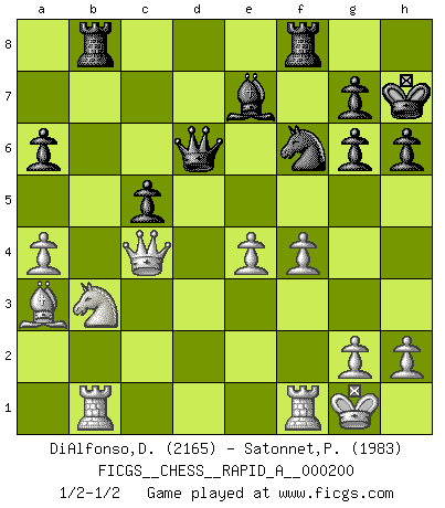 Last move : 1/2-1/2 2017 May 7 12:31:15 [Event "FICGS__CHESS__RAPID_A__000200"] [Site "FICGS"] [Date "2017.03.07"] [Round "1"] [White "DiAlfonso,Darren"] [Black "Satonnet,Patrick"] [Result "1/2-1/2"] [WhiteElo "2165"] [BlackElo "1983"] 1.d4 d5 2.c4 dxc4 3.Nf3 a6 4.e3 b5 5.a4 Bb7 6.b3 e6 7.bxc4 bxc4 8.Bxc4 Nf6 9.O-O c5 10.Nbd2 Nbd7 11.Rb1 Bc6 12.Qc2 Be7 13.e4 h6 14.Nh4 O-O 15.Ng6 fxg6 16.Bxe6+ Kh7 17.d5 Ne5 18.dxc6 Nxc6 19.Nb3 Qd6 20.Bc4 Ne5 21.f4 Nxc4 22.Qxc4 Rab8 23.Ba3 1/2-1/2 QGA : Haberditz variation Kingside Castling by player White (move 9) Kingside Castling by player Black (move 14) This chess game ended in a draw. Follow this game move after move (download)I play correspondence chess because it is both art and science while chess is art only. (A player at FICGS) Bobby Fischer ist kein Vorbild für die heutige Jugend. (Viktor Kortschnoi) El Ajedrez, como la música, como el amor, tiene el poder de hacer feliz a la gente. (Siegbert Tarrasch) Dans le domaine de la peinture, de la gravure et de la sculpture, dès la première décennie de notre siècle, les artistes abandonnent la représentation de la partie d'échecs pour se concentrer sur les pièces, sur les échiquiers et sur toutes les variations auxquelles les unes et les autres peuvent donner lieu. On passe en quelque sorte d'un thème social à un thème musical (au sens de la musica médiévale, c'est-à-dire d'une notion qui inclue le rythme, l'harmonie, la construction et la déconstruction, etc.). Graphiquement et picturalement, l'échiquier apparaît comme une structure ouverte, dynamique, d'une richesse infinie, autorisant toutes les combinatoires et débouchant sur des mouvements et des rythmes de nature exponentielle. (Michel Pastoureau) All maxims have their antagonist maxims; proverbs should be sold in pairs, a single one being but a half truth. (William Mathews)