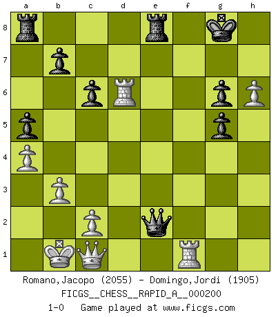 Last move : 1-0 2017 July 9 11:15:7 [Event "FICGS__CHESS__RAPID_A__000200"] [Site "FICGS"] [Date "2017.03.07"] [Round "1"] [White "Romano,Jacopo"] [Black "Domingo,Jordi"] [Result "1-0"] [WhiteElo "2055"] [BlackElo "1905"] 1.e4 e5 2.Nf3 d6 3.d4 exd4 4.Nxd4 Nf6 5.Nc3 Be7 6.Bf4 O-O 7.Qd2 Nc6 8.O-O-O Nxd4 9.Qxd4 Be6 10.f3 Nd7 11.Qd2 Bf6 12.h4 Ne5 13.Kb1 Rb8 14.Bg5 Be7 15.Be2 Nc4 16.Bxc4 Bxc4 17.b3 Be6 18.Nb5 a6 19.Nd4 Ra8 20.g4 a5 21.a4 Re8 22.Bxe7 Qxe7 23.h5 f6 24.Qc3 c6 25.h6 g6 26.g5 Bf7 27.f4 Qxe4 28.Rhf1 Qe3 29.Rd3 Qe7 30.Nf3 Qd7 31.Nh4 Qe7 32.f5 Qe5 33.Qd2 Qe2 34.Qc1 fxg5 35.fxg6 Bxg6 36.Nxg6 hxg6 37.Rxd6 1-0 Philidor : Exchange variation Kingside Castling by player Black (move 6) Queenside Castling by player White (move 8) Player White won this chess game. Follow this game move after move (download)All I want to do, ever, is just play Chess. (Bobby Fischer) Ich trinke, ich rauche, ich spiele, ich liebe Frauen aber Fernschach ist ein Laster, das ich nicht habe. (Mikhail Nekhemyevich Tal) El Ajedrez es una manera fabulosa para que los niños aprendan a autovalorarse y a autoestimarse. (Saudin Robovic) En blitz, le Cavalier l'emporte sur le Fou. (Vlastimil Hort) He who laughs last probably does not get the joke. (Unknown)