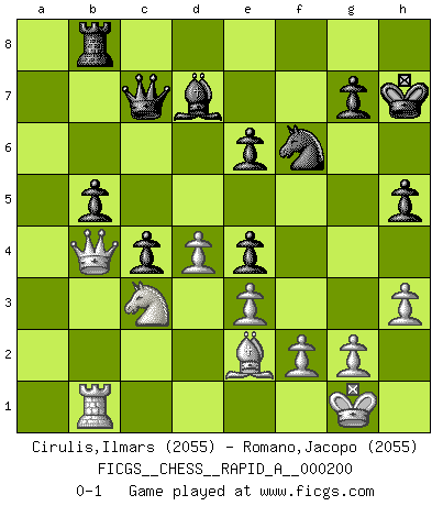 Last move : 0-1 2017 April 22 22:26:7 [Event "FICGS__CHESS__RAPID_A__000200"] [Site "FICGS"] [Date "2017.03.07"] [Round "1"] [White "Cirulis,Ilmars"] [Black "Romano,Jacopo"] [Result "0-1"] [WhiteElo "2055"] [BlackElo "2055"] 1.b4 e5 2.a3 d5 3.e3 Nf6 4.Bb2 Nbd7 5.c4 c6 6.Nf3 Bd6 7.d4 e4 8.Nfd2 O-O 9.Nc3 a6 10.Be2 Re8 11.cxd5 cxd5 12.Qb3 Nb6 13.a4 Be6 14.a5 Nc8 15.O-O Na7 16.Rfc1 Nc6 17.Ba3 h5 18.b5 Bxa3 19.Rxa3 axb5 20.Qxb5 Nxa5 21.Qb2 b6 22.Rb1 Rb8 23.Na4 Nc4 24.Nxc4 dxc4 25.Qb5 Bd7 26.Qb4 Qc7 27.Nc3 b5 28.Ra6 Re6 29.Rxe6 fxe6 30.h3 Kh7 0-1 Polish (Sokolsky) opening Kingside Castling by player Black (move 8) Kingside Castling by player White (move 15) Player Black won this chess game. Follow this game move after move (download)Bobby is the finest Chess player this country ever produced. His memory for the moves, his brilliance in dreaming up combinations, and his fierce determination to win are uncanny. (John Collins) Die Fehler sind da, Sie warten nur darauf gemacht zu werden. (Savielly Grigorievitsch Tartakower) No puedes jugar al Ajedrez si eres de corazón noble. (Proverbio Francés) Soyez une menace à chaque fois que vous vous asseyez pour jouer. (Ken Smith) Life is like a game of cards: the hand you are dealt represents determinism; the way you play it is free will. (Jawaharlal Nehru)