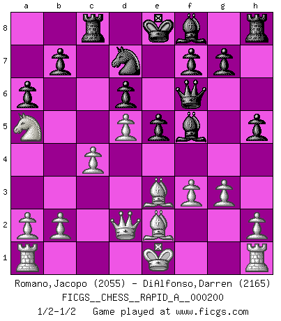Last move : 1/2-1/2 2017 March 18 16:38:20 [Event "FICGS__CHESS__RAPID_A__000200"] [Site "FICGS"] [Date "2017.03.07"] [Round "1"] [White "Romano,Jacopo"] [Black "DiAlfonso,Darren"] [Result "1/2-1/2"] [WhiteElo "2055"] [BlackElo "2165"] 1.e4 c5 2.Nf3 d6 3.d4 cxd4 4.Nxd4 Nf6 5.Nc3 a6 6.Be3 e5 7.Nb3 Be6 8.f3 h5 9.Qd2 Nbd7 10.Nd5 Nxd5 11.exd5 Bf5 12.Be2 Qh4+ 13.g3 Qf6 14.Na5 Rc8 15.c4 1/2-1/2 Sicilian : Najdorf, Byrne (English) attack This chess game ended in a draw. Follow this game move after move (download)A Chess game is a dialogue, a conversation between a player and his opponent. Each move by the opponent may contain threats or be a blunder, but a player cannot defend against threats or take advantage of blunders if he does not first ask himself: What is my opponent planning after each move ? (Bruce A. Moon) In Buenos Aires ist es nicht mein vorrangiges Ziel ein starkes Turnier zu organisieren, sondern ein Turnier für Gentlemen. Ich würde nie Kamsky einladen. Ich mag keine Probleme. (Miguel Najdorf) Cada Peón es potencialmente una Reina. (James Mason) Aux échecs, l'amour-propre est satisfait quand on remporte la victoire, mais il n'y a pas de honte à être battu. (Benjamin Franklin) The problem with manipulation is that people can turn on you. (Horatio Caine, C.S.I. Miami)
