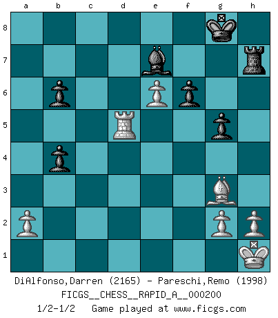 Last move : 1/2-1/2 2017 March 21 1:22:33 [Event "FICGS__CHESS__RAPID_A__000200"] [Site "FICGS"] [Date "2017.03.07"] [Round "1"] [White "DiAlfonso,Darren"] [Black "Pareschi,Remo"] [Result "1/2-1/2"] [WhiteElo "2165"] [BlackElo "1998"] 1.d4 d5 2.c4 e6 3.Nf3 c6 4.Nc3 Nf6 5.Bg5 h6 6.Bh4 dxc4 7.e4 g5 8.Bg3 b5 9.Be2 Bb7 10.O-O Be7 11.Ne5 Nbd7 12.f4 O-O 13.fxg5 hxg5 14.Qc2 Nxe5 15.Bxe5 Ne8 16.Rad1 f6 17.Bg3 Ng7 18.b3 cxb3 19.Qxb3 Qb6 20.Kh1 Rac8 21.Bg4 Rcd8 22.Bxe6+ Nxe6 23.Qxe6+ Rf7 24.e5 c5 25.Qxb6 axb6 26.e6 Rh7 27.dxc5 Rxd1 28.Rxd1 b4 29.c6 Bxc6 30.Nd5 Bxd5 31.Rxd5 1/2-1/2 Queen's gambit declined Kingside Castling by player White (move 10) Kingside Castling by player Black (move 12) This chess game ended in a draw. Follow this game move after move (download)The essence of Chess is thinking about what Chess is. (David Bronstein) Obendrein hat der FIDE-Präsident den Revolutionsführer Gaddafi zum »Großmeister« ernannt, am Ende der WM. Das ist lächerlich! (Joel Lautier) Botvinnik trató de alejar el misterio referente al Ajedrez, siempre relacionandolo a situaciones de la vida diaria. Solía llamar al Ajedrez un problema inexacto típico, similar a aquellos en que la gente tiene siempre que resolver a cada día. (Garry Kasparov) Une platitude souvent récitée à propos des Echecs est qu'une des choses les plus difficiles à réaliser est de gagner une position gagnante. Cela ne manque pas de sens mais, pour ma part, j'ai toujours trouvé plus difficile de gagner une position perdante. (Tim Krabbe) If you work for a living, why do you kill yourself working ? (Tuco to a chicken in The Good, The Bad and The Ugly)