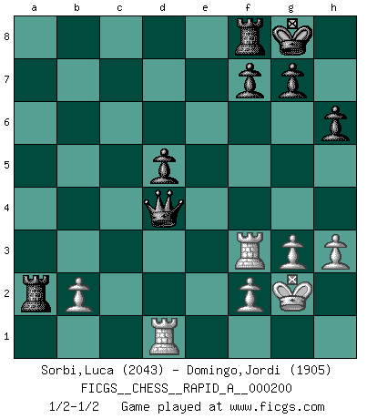 Last move : 1/2-1/2 2017 June 17 5:26:43 [Event "FICGS__CHESS__RAPID_A__000200"] [Site "FICGS"] [Date "2017.03.07"] [Round "1"] [White "Sorbi,Luca"] [Black "Domingo,Jordi"] [Result "1/2-1/2"] [WhiteElo "2043"] [BlackElo "1905"] 1.e4 e5 2.Nf3 Nc6 3.Bb5 Bb4 4.c3 Ba5 5.O-O Nge7 6.d4 exd4 7.cxd4 d5 8.exd5 Qxd5 9.Qa4 O-O 10.Nc3 Qh5 11.Re1 Be6 12.Ne5 Bb6 13.Bxc6 Nxc6 14.Nxc6 bxc6 15.Be3 Bd5 16.Nxd5 cxd5 17.Bd2 Qg4 18.Bc3 c5 19.Rad1 Rac8 20.h3 Qf4 21.Ba5 h6 22.g3 Qf3 23.Bxb6 axb6 24.Re3 Qf5 25.Kg2 Ra8 26.Qb5 cxd4 27.Rf3 Qe4 28.Qxb6 Rxa2 29.Qxd4 Qxd4 1/2-1/2 Ruy Lopez (Spanish Opening) Kingside Castling by player White (move 5) Kingside Castling by player Black (move 9) This chess game ended in a draw. Follow this game move after move (download)Adequate compensation for a sacrifice is having a sound combination leading to a winning position; adequate compensation for a blunder is having your opponent snatch defeat from the jaws of victory. (Bruce A. Moon) Ich kenne keine einzige Person, die behaupten würde, Garri Kasparow sei ein guter Mensch (Nigel Short) La esencia del Ajedrez es pensar acerca de lo que el Ajedrez es. (David Bronstein) Les pièces de l'échiquier étaient impitoyables. Elles le retenaient, elles l'absorbaient. Il y avait de l'horreur en cela, mais aussi une harmonie unique. Car, qu'y a-t-il dans le monde, à part les échecs ? (V. Nabokov) The ultimate in disposing one's troops is to be without ascertainable shape. Then the most penetrating spies cannot pry in nor can the wise lay plans against you. (Sun Tzu)