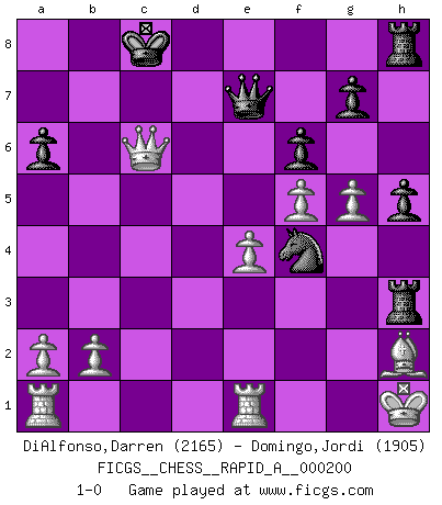 Last move : 1-0 2017 June 13 18:5:26 [Event "FICGS__CHESS__RAPID_A__000200"] [Site "FICGS"] [Date "2017.03.07"] [Round "1"] [White "DiAlfonso,Darren"] [Black "Domingo,Jordi"] [Result "1-0"] [WhiteElo "2165"] [BlackElo "1905"] 1.d4 d5 2.c4 dxc4 3.Nf3 a6 4.e3 Bg4 5.Bxc4 e6 6.O-O Nf6 7.Nc3 Nc6 8.h3 Bh5 9.Re1 Bd6 10.g4 Bg6 11.e4 h5 12.g5 Nd7 13.Nh4 Bh7 14.d5 Nce5 15.Bb3 Nc5 16.Bc2 exd5 17.f4 d4 18.Qxd4 Ne6 19.Qf2 Nc4 20.Kh1 Bc5 21.Qf1 b5 22.Qg2 c6 23.Bb3 Qd4 24.Rf1 O-O-O 25.f5 Nc7 26.Nf3 Qd7 27.Bxc4 bxc4 28.Ne5 Qe8 29.Nxc4 f6 30.Na4 Bg8 31.Nxc5 Bxc4 32.Re1 Qe7 33.Be3 Nd5 34.Bg1 Nf4 35.Qc2 Bd3 36.Nxd3 Rxd3 37.Bh2 Rxh3 38.Qxc6+ 1-0 QGA : Alekhine defense Kingside Castling by player White (move 6) Queenside Castling by player Black (move 24) Player White won this chess game. Follow this game move after move (download)An attack on the wing should be met by play in the center. (Nimzovitch) Ivan Sokolov treibt mich als Beifahrer an mit go Loeky go - . (Loek van Wely) Personalmente, yo prefiero mirar hacia el futuro en donde un programa de computadora gane el título mundial de Ajedrez. La humanidad necesita una lección de humildad. (Richard Dawkings) Les Echecs sont affaire de jugement sensible. Savoir quand frapper et quand esquiver. (Fischer) My poor ole parrot... Is not in the circulation of displays ....poo hoo hoo :) (Wayne Lowrance's enigma)