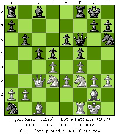 Last move : 0-1 2007 August 1 19:47:10 [Event "FICGS__CHESS__CLASS_G__000012"] [Site "FICGS"] [Date "2007.04.04"] [Round "1"] [White "Fayol,Romain"] [Black "Bothe,Matthias"] [Result "0-1"] [WhiteElo "1176"] [BlackElo "1087"] 1.f4 f5 2.Nf3 d5 3.d3 Nf6 4.g3 e6 5.Bg2 Bc5 6.e3 O-O 7.O-O Ng4 8.Qe1 Qf6 9.h3 Nh6 10.Nbd2 Nc6 11.Nb3 Nb4 12.Nxc5 Nxc2 13.Qc3 Nxa1 14.d4 b6 15.Nd3 c5 0-1 This chess game has been lost on time (started : 2007.04.04 16:0:44) Bird's Opening Kingside Castling by player Black (move 6) Kingside Castling by player White (move 7) Player Black won this chess game. Follow this game move after move (download)Human affairs are like a Chess game: only those who do not take it seriously can be called good players. (Hung Tzu Ch'eng) Die unerbitterlichsten Regeln im Schach sind die Ausnahmen. (Savielly Grigorievitsch Tartakower) Si tu oponente no puede hacer nada activo, entonces no apures la posición; En vez de eso, dejalo estar sentado ahí, sufriendo y rogandote por un empate. (Jeremy Silman) Les pièces de l'échiquier étaient impitoyables. Elles le retenaient, elles l'absorbaient. Il y avait de l'horreur en cela, mais aussi une harmonie unique. Car, qu'y a-t-il dans le monde, à part les échecs ? (V. Nabokov) I can't decide which is riskier; taking crazy risks, or taking advice on crazy risks from a crazy risk taker. (Gregory House in House M.D.)