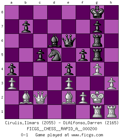 Last move : 0-1 2017 May 1 15:59:28 [Event "FICGS__CHESS__RAPID_A__000200"] [Site "FICGS"] [Date "2017.03.07"] [Round "1"] [White "Cirulis,Ilmars"] [Black "DiAlfonso,Darren"] [Result "0-1"] [WhiteElo "2055"] [BlackElo "2165"] 1.b4 e5 2.a3 d5 3.e3 Nf6 4.Bb2 Bd6 5.c4 dxc4 6.Bxc4 O-O 7.Ne2 Nbd7 8.Ng3 a5 9.b5 Nb6 10.Be2 a4 11.O-O Re8 12.Qc2 Be6 13.d3 Bb3 14.Qc1 h5 15.h3 Ra5 16.Nd2 Rxb5 17.Nxb3 Rxb3 18.Nxh5 Nxh5 19.Bxh5 Rxd3 20.Be2 Rb3 21.Bd1 Rb5 22.Be2 Rc5 23.Qb1 e4 24.Rd1 Rg5 25.Bd4 c5 26.Bb2 Re6 27.Qc2 Reg6 28.g4 Qe7 29.Kg2 f5 30.Rh1 Qe6 31.Rag1 Nd5 0-1 Polish (Sokolsky) opening Kingside Castling by player Black (move 6) Kingside Castling by player White (move 11) Player Black won this chess game. Follow this game move after move (download)Chess, like love, like music, has the power to make people happy. (Siegbert Tarrasch) Heutzutage gewinnt im Turnier nicht derjenige Spieler, der weitreichende Pläne entwirft, sondern einfach jener, der Zug um Zug kämpft. (David Bronstein) Fischer es una tragedia del Ajedrez Americano a la par con Morphy y Pillsbury. (Mig Greengard) Les échecs, c'est la lutte contre l'erreur. (Johannes Zukertort) Thibault, I ask for draw. Game 13876. - Sorry Ilmars, you won. (FICGS chat)