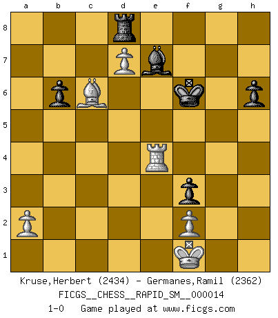 Last move : 1-0 2017 July 26 12:43:15 [Event "FICGS__CHESS__RAPID_SM__000014"] [Site "FICGS"] [Date "2017.03.16"] [Round "1"] [White "Kruse,Herbert"] [Black "Germanes,Ramil"] [Result "1-0"] [WhiteElo "2434"] [BlackElo "2362"] 1.Nf3 Nf6 2.d4 e6 3.c4 d5 4.Nc3 c6 5.Bg5 h6 6.Bxf6 Qxf6 7.e3 Nd7 8.Bd3 dxc4 9.Bxc4 g6 10.e4 e5 11.O-O Bg7 12.d5 Nb6 13.Bb3 Bg4 14.Qd3 O-O 15.Nd2 Qg5 16.Rfe1 Rac8 17.Re3 cxd5 18.exd5 f5 19.h3 Bh5 20.Nce4 Qh4 21.d6 Kh7 22.g4 Bxg4 23.hxg4 fxe4 24.Nxe4 Nd7 25.Rd1 Qxg4+ 26.Rg3 Qf5 27.Bc2 Nf6 28.Nxf6+ Rxf6 29.Qxf5 gxf5 30.d7 Rd8 31.Rc3 Bf8 32.Rd5 Kg7 33.Rg3+ Kh8 34.Kf1 f4 35.Rb3 b6 36.Rc3 Bc5 37.b4 Be7 38.Rc7 Kg7 39.Rxa7 Rc6 40.Rxe5 Kf6 41.Ba4 Rc1+ 42.Re1 Rxe1+ 43.Kxe1 f3 44.Rc7 Bxb4+ 45.Kf1 Kg5 46.Rc4 Be7 47.Re4 Kf6 48.Bc6 1-0 Reti Opening Kingside Castling by player White (move 11) Kingside Castling by player Black (move 14) Player White won this chess game. Follow this game move after move (download)Chess problems demand from the composer the same virtues that characterize all worthwhile art: originality, invention, conciseness, harmony, complexity, and splendid insincerity. (Vladimir Nabokov) Es gibt Leute, die glauben, alles wäre vernünftig, was man mit einem ernsthaften Gesicht tut. (Georg Christoph Lichtenberg) El sobresalir en el Ajedrez es un signo de una mente intrigante. (Sir Arthur Conan Doyle) Les Cavaliers se révèlent fort utiles dans les positions fermées. D'habitude, les Fous sont un peu plus forts que les Cavaliers dans les positions ouvertes. Qu'on le veuille ou non, il restera toujours des exceptions ! The worth of a book is to be measured by what you can carry away from it. (James Bryce)