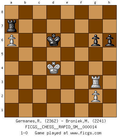 Last move : 1-0 2017 September 18 8:33:18 [Event "FICGS__CHESS__RAPID_SM__000014"] [Site "FICGS"] [Date "2017.03.16"] [Round "1"] [White "Germanes,Ramil"] [Black "Broniek,Mariusz Maciej"] [Result "1-0"] [WhiteElo "2362"] [BlackElo "2241"] 1.e4 c5 2.Nf3 Nc6 3.Bb5 g6 4.O-O Bg7 5.d3 Nf6 6.Nc3 O-O 7.e5 Ng4 8.Bxc6 bxc6 9.Re1 f6 10.exf6 Nxf6 11.Qe2 e6 12.Ne4 d6 13.Bg5 e5 14.c3 Bf5 15.Nfd2 Qd7 16.Nxf6+ Bxf6 17.Bxf6 Rxf6 18.Ne4 Rf7 19.b3 a5 20.Rad1 a4 21.b4 cxb4 22.cxb4 a3 23.h3 Rb8 24.Qd2 c5 25.Ng5 R7f8 26.bxc5 dxc5 27.Qc3 Qd4 28.Qxa3 Rb2 29.Rf1 Bg4 30.Rc1 Rbxf2 31.Rxf2 Qxf2+ 32.Kh1 Qf4 33.hxg4 Qxg5 34.Qxc5 Qxg4 35.Qd5+ Kg7 36.Qxe5+ Kh6 37.Qh2+ Qh5 38.a4 Rd8 39.a5 Rxd3 40.Ra1 Qxh2+ 41.Kxh2 Rd7 42.a6 Ra7 43.Kg3 Kg5 44.Ra5+ Kf6 45.Kf4 h6 46.Ke4 Ke6 47.Ra1 Kd6 48.Ra3 Ke6 49.Kd4 Kd6 50.Rg3 1-0 This chess game has been lost on time (started : 2017.03.16 17:54:47) Sicilian : Nimzovich-Rossolimo attack (with ...g6, without ...d6) Kingside Castling by player White (move 4) Kingside Castling by player Black (move 6) 10 pieces endgame at move 39 : White KQRPP , Black KQRPP WHITE : King + 1 Queen 1 Rook 2 Pawns BLACK : King + 1 Queen 1 Rook 2 Pawns 9 pieces endgame at move 40 : White KRPP , Black KQRPP WHITE : King + 1 Rook 2 Pawns BLACK : King + 1 Queen 1 Rook 2 Pawns 8 pieces endgame at move 41 : White KRPP , Black KRPP WHITE : King + 1 Rook 2 Pawns BLACK : King + 1 Rook 2 Pawns Player White won this chess game. Follow this game move after move (download)If I win a tournament, I win it by myself. I do the playing. Nobody helps me. (Bobby Fischer) Wenn ich einen Club besuche, sind die Spieler stumm vor Staunen. (José Raúl Capablanca) Nos gusta pensar. (Gary Kasparov) On a dit que l'homme se distingue de l'animal par le fait qu'il achète plus de livres qu'il ne peut en lire. Je voudrais suggérer qu'inclure à la liste des livres quelques livres d'échecs rendrait la distinction manifeste. (Edward Lasker) I would love to change the world, but they won't give me the source code. (Unknown)