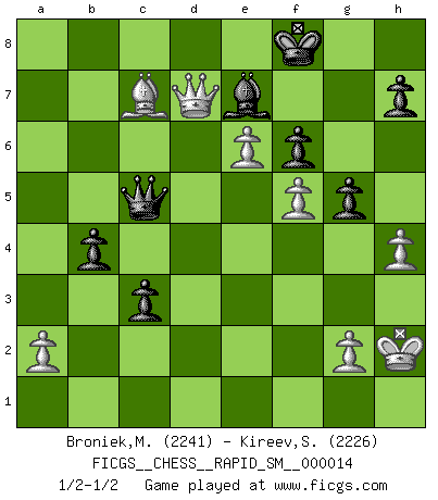 Last move : 1/2-1/2 2017 June 30 5:21:4 [Event "FICGS__CHESS__RAPID_SM__000014"] [Site "FICGS"] [Date "2017.03.16"] [Round "1"] [White "Broniek,Mariusz Maciej"] [Black "Kireev,Sergey"] [Result "1/2-1/2"] [WhiteElo "2241"] [BlackElo "2226"] 1.e4 e5 2.Nf3 Nc6 3.Bb5 a6 4.Ba4 Nf6 5.O-O Be7 6.Re1 b5 7.Bb3 O-O 8.c3 d5 9.d4 exd4 10.e5 Ne4 11.cxd4 Bf5 12.Nc3 Nxc3 13.bxc3 Na5 14.Bc2 Bxc2 15.Qxc2 Nc4 16.Nd2 c5 17.Nxc4 dxc4 18.Be3 cxd4 19.Bxd4 Qd5 20.Rad1 Qc6 21.f4 Rad8 22.f5 f6 23.e6 a5 24.Bf2 b4 25.cxb4 Rxd1 26.Rxd1 axb4 27.Rd7 Re8 28.h4 c3 29.Bg3 Rd8 30.Qd3 Rxd7 31.Qxd7 Qc5+ 32.Kh2 Kf8 33.Bc7 g5 1/2-1/2 Ruy Lopez : Closed, 7...O-O Kingside Castling by player White (move 5) Kingside Castling by player Black (move 7) This chess game ended in a draw. Follow this game move after move (download)There are two classes of men; those who are content to yield to circumstances and who play whist; those who aim to control circumstances, and who play Chess. (Mortimer Collins) Dein Körper muss in Topform sein. Dein Schach verfällt, wenn dein Körper verfällt. Der Körper kann nicht vom Geist getrennt werden. (Robert James Fischer) Tu no necesitas jugar muy bien, únicamente ayudar a tu oponenet a que juegue muy mal. (Genrikh Chepukaitis) Soyez une menace à chaque fois que vous vous asseyez pour jouer. (Ken Smith) Every man's memory is his private literature. (Aldous Huxley)