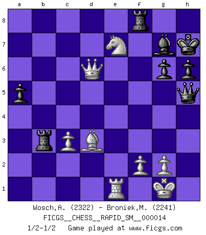 Last move : 1/2-1/2 2017 July 17 4:37:12 [Event "FICGS__CHESS__RAPID_SM__000014"] [Site "FICGS"] [Date "2017.03.16"] [Round "1"] [White "Wosch,Arkadiusz"] [Black "Broniek,Mariusz Maciej"] [Result "1/2-1/2"] [WhiteElo "2322"] [BlackElo "2241"] 1.e4 c5 2.Nf3 Nc6 3.d4 cxd4 4.Nxd4 Nf6 5.Nc3 e5 6.Ndb5 d6 7.Bg5 a6 8.Na3 b5 9.Nd5 Be7 10.Bxf6 Bxf6 11.c3 Bg5 12.Nc2 O-O 13.a4 bxa4 14.Rxa4 a5 15.Bc4 Rb8 16.b3 Kh8 17.O-O f5 18.exf5 Bxf5 19.Nce3 Bg6 20.Qe2 e4 21.Ng4 h6 22.Qc2 Qe8 23.Qd1 Bh5 24.h3 Qc8 25.Qe1 Bxg4 26.hxg4 Qxg4 27.Bd3 Rxb3 28.Rxe4 Qh5 29.Re6 Ne5 30.Rxe5 dxe5 31.Qe4 g6 32.Qxe5+ Bf6 33.Qd6 Bg7 34.Re1 Kh7 35.Ne7 1/2-1/2 Sicilian : Pelikan (Lasker/Sveshnikov) variation Kingside Castling by player Black (move 12) Kingside Castling by player White (move 17) This chess game ended in a draw. Follow this game move after move (download)No other master has such a terrific will to win. At the board he radiates danger, and even the strongest opponents tend to freeze, like rabbits when they smell a panther. Even his weaknesses are dangerous. As white, his opening game is predictable - you can make plans against it - but so strong that your plans almost never work. In the middle game his precision and invention are fabulous, and in the end game you simply cannot beat him. (Anonymous German Expert) Wer der Ansicht ist, daß alle Schachspieler verrückt sind, wird durch Studium des Lebens von Emil Josef Diemer nicht auf andere Gedanken kommen. (Hans Ree) Los Peones son nacidos libres, y aún así, se encuentran por doquier encadenados. (Rick Kennedy) Aux échecs, l'amour-propre est satisfait quand on remporte la victoire, mais il n'y a pas de honte à être battu. (Benjamin Franklin) The age of a woman doesn't mean a thing. The best tunes are played on the oldest fiddles. (Ralph Waldo Emerson)