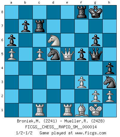 Last move : 1/2-1/2 2017 July 11 6:7:43 [Event "FICGS__CHESS__RAPID_SM__000014"] [Site "FICGS"] [Date "2017.03.16"] [Round "1"] [White "Broniek,Mariusz Maciej"] [Black "Mueller,Robert"] [Result "1/2-1/2"] [WhiteElo "2241"] [BlackElo "2428"] 1.e4 c5 2.Nf3 d6 3.d4 cxd4 4.Nxd4 Nf6 5.Nc3 a6 6.Be2 e5 7.Nb3 Be7 8.Be3 Be6 9.Qd3 Nbd7 10.Nd5 O-O 11.O-O Bxd5 12.exd5 Ne8 13.a4 g6 14.a5 f5 15.f3 Bg5 16.Nd2 Rc8 17.c4 Ng7 18.b4 Nh5 19.Rfe1 Bf4 20.Bxf4 Nxf4 21.Qe3 Qg5 22.Bf1 h5 23.c5 h4 24.Nc4 dxc5 25.Nd6 Rc7 26.Rac1 Nf6 27.Qxe5 N6xd5 28.bxc5 Nh3+ 1/2-1/2 Sicilian : Najdorf, Opovcensky variation Kingside Castling by player Black (move 10) Kingside Castling by player White (move 11) This chess game ended in a draw. Follow this game move after move (download)All that matters on the Chessboard is good moves. (Bobby Fischer) Das Schach hält seine Meister in eigenen Banden, Fesseln; auf vielerlei Weise formt es ihren Geist, so dass die innere Freiheit selbst des Stärksten beeinflusst wird. (Albert Einstein) El Ajedrez, como cualquier otra actividad creativa, puede existir solo a través de méritos combinados de aquellos que tienen talento creativo y de aquellos que tienen la habilidad de organizar un trabajo creativo. (Mikhail Botvinnik) C'est une question de caractère, Beaucoup de gens perdent leur motivation très vite. D'autres, ils sont rares, peuvent la conserver très longtemps. J'aime les échecs, encore aujourd'hui je suis heureux d'analyser des parties. J'aime toujours gagner, je déteste encore perdre. Bien jouer est important pour mon intégrité intellectuelle et morale. Et puis les échecs vivent en ce moment une période historique grâce à Internet. Ils se développent dans les systèmes éducatifs à travers le monde. Ils sortent de leur ghetto, et c'est mon rôle de mener à bien cette révolution. (Gary Kasparov) The real voyage of discovery consists not in seeking new lands but in seeing with new eyes. (Marcel Proust)