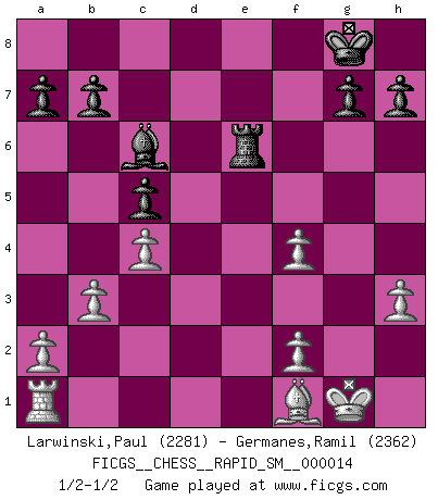 Last move : 1/2-1/2 2017 April 23 14:49:25 [Event "FICGS__CHESS__RAPID_SM__000014"] [Site "FICGS"] [Date "2017.03.16"] [Round "1"] [White "Larwinski,Paul"] [Black "Germanes,Ramil"] [Result "1/2-1/2"] [WhiteElo "2281"] [BlackElo "2362"] 1.d4 Nf6 2.c4 e6 3.Nf3 d5 4.Nc3 c6 5.Qd3 Nbd7 6.e4 dxe4 7.Nxe4 Nxe4 8.Qxe4 Bb4+ 9.Bd2 Bxd2+ 10.Nxd2 O-O 11.Be2 Re8 12.O-O e5 13.dxe5 Nxe5 14.Rfd1 Qb6 15.b3 Bd7 16.Qc2 c5 17.Nf3 Bc6 18.Nxe5 Rxe5 19.Bf1 Rae8 20.Qc3 f5 21.Re1 Qc7 22.g3 f4 23.Rxe5 Qxe5 24.Qxe5 Rxe5 25.gxf4 Re6 26.h3 1/2-1/2 Queen's pawn game Kingside Castling by player Black (move 10) Kingside Castling by player White (move 12) This chess game ended in a draw. Follow this game move after move (download)My style is somewhere between that of Tal and Petrosian. (Reshevsky) Charakterschwächen offenbaren sich normalerweise während einer Schachpartie. (Garry Kasparov) El Ajedrez es un cuento de Hadas de las 1001 metidas de pata. (Savielly Tartakower) Mon pion favori sur ma case favorite ! Bronstein en parlant d'un coup de pion en h5 quand il avait les Noirs. Perseverance does not equal worthiness. Next time you want to get my attention, wear something fun. Low-riding jeans are hot. (Gregory House, House M.D.)