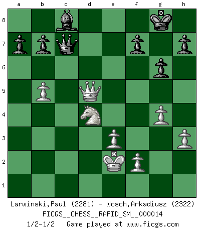 Last move : 1/2-1/2 2017 May 25 15:33:12 [Event "FICGS__CHESS__RAPID_SM__000014"] [Site "FICGS"] [Date "2017.03.16"] [Round "1"] [White "Larwinski,Paul"] [Black "Wosch,Arkadiusz"] [Result "1/2-1/2"] [WhiteElo "2281"] [BlackElo "2322"] 1.d4 Nf6 2.c4 e6 3.Nc3 Bb4 4.e3 O-O 5.Nf3 d5 6.Bd3 c5 7.O-O Nc6 8.cxd5 exd5 9.dxc5 Bxc5 10.h3 Bb4 11.Ne2 Ne4 12.a3 Be7 13.b4 Bf6 14.Ra2 Re8 15.Bb2 Bxb2 16.Rxb2 Qf6 17.Nfd4 Bd7 18.Qb3 Nxd4 19.Nxd4 Rad8 20.Rc1 Qg5 21.Kf1 Rc8 22.Qd1 Nd6 23.Rxc8 Rxc8 24.b5 g6 25.Rc2 Nc4 26.Qc1 Qe7 27.Bxc4 dxc4 28.Rxc4 Rxc4 29.Qxc4 Qxa3 30.Qd5 Qc1+ 31.Ke2 Qc7 32.g4 Bc8 1/2-1/2 Nimzo-Indian : 4.e3, Main line with 7...Nc6 Kingside Castling by player Black (move 4) Kingside Castling by player White (move 7) This chess game ended in a draw. Follow this game move after move (download)Fischer prefers to enter Chess history alone. (Miguel Najdorf) Am wohlsten fühle ich mich, wenn ich sehe, wie sich mein Gegner im Todeskampf windet. (Robert James Fischer) Personalmente, yo prefiero mirar hacia el futuro en donde un programa de computadora gane el título mundial de Ajedrez. La humanidad necesita una lección de humildad. (Richard Dawkings) On est toujours la mazette de quelqu'un d'autre. (Anonyme) Now be brave and don't look back. Don't look back. (Shmi Skywalker in Star Wars ep.1)