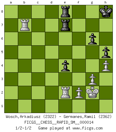 Last move : 1/2-1/2 2017 August 9 22:40:17 [Event "FICGS__CHESS__RAPID_SM__000014"] [Site "FICGS"] [Date "2017.03.16"] [Round "1"] [White "Wosch,Arkadiusz"] [Black "Germanes,Ramil"] [Result "1/2-1/2"] [WhiteElo "2322"] [BlackElo "2362"] 1.e4 c5 2.Nf3 Nc6 3.d4 cxd4 4.Nxd4 Nf6 5.Nc3 e5 6.Ndb5 d6 7.Bg5 a6 8.Na3 b5 9.Nd5 Be7 10.Bxf6 Bxf6 11.c3 Bg5 12.Nc2 Rb8 13.a4 bxa4 14.Ncb4 Nxb4 15.cxb4 Bd7 16.Bxa6 O-O 17.O-O Bc6 18.Bc4 Qd7 19.b3 axb3 20.Bxb3 Bxd5 21.Bxd5 Rxb4 22.Ra6 Kh8 23.Qh5 Bd2 24.Bxf7 Qe7 25.Bg6 Bh6 26.Bf5 Qg5 27.Qxg5 Bxg5 28.g3 g6 29.Be6 Bd8 30.Rxd6 Bb6 31.Rd2 Rxe4 32.Rb2 Bc5 33.Rc2 Bb4 34.Kg2 Rd4 35.Rb1 e4 36.Bd5 Re8 37.Re2 Rxd5 38.Rxb4 Rde5 39.h4 h5 40.Rb7 R5e7 1/2-1/2 Sicilian : Pelikan (Lasker/Sveshnikov) variation Kingside Castling by player Black (move 16) Kingside Castling by player White (move 17) This chess game ended in a draw. Follow this game move after move (download)There must have been a time when men were demigods, or they could not have invented Chess. (Gustav Schenk) Jeder leidlich begabte Spieler, er braucht keineswegs hervorragend veranlagt zu sein, kann es zum Meister bringen. Aber das ist ja auch gar nicht nötig! Der richtige Standpunkt ist es, zu seinem Vergnügen zu spielen, und man glaube ja nicht, dass der Genuss proportional dem Können sei. (Siegbert Tarrasch) Aquellos que dicen que entienden al Ajedrez, no entienden nada. (Robert Hubner) Le moment que je préfère le plus dans une rencontre, c'est celui où je sens que la personnalité de l'adversaire se brise. (Robert Fischer) Knowledge will give you power, but character respect. (Bruce Lee)