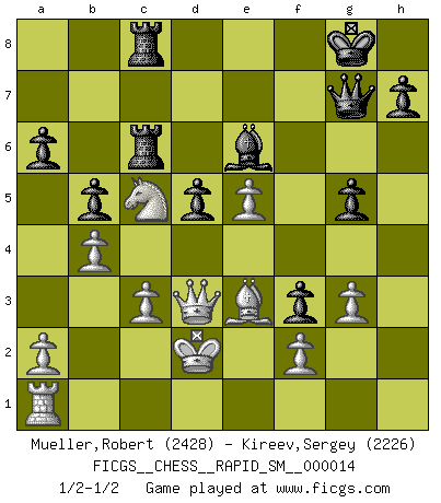 Last move : 1/2-1/2 2017 April 29 19:44:19 [Event "FICGS__CHESS__RAPID_SM__000014"] [Site "FICGS"] [Date "2017.03.16"] [Round "1"] [White "Mueller,Robert"] [Black "Kireev,Sergey"] [Result "1/2-1/2"] [WhiteElo "2428"] [BlackElo "2226"] 1.e4 e5 2.Nf3 Nc6 3.Bb5 a6 4.Ba4 Nf6 5.O-O Be7 6.Re1 b5 7.Bb3 O-O 8.c3 d5 9.exd5 Nxd5 10.Nxe5 Nxe5 11.Rxe5 c6 12.d4 Bd6 13.Re1 Qh4 14.g3 Qh3 15.Re4 g5 16.Qf1 Qh5 17.Nd2 f5 18.Bd1 Qh6 19.Re1 f4 20.Ne4 Bc7 21.Bd2 Bf5 22.Nc5 Bh3 23.Qe2 f3 24.Qe4 Qh5 25.Bb3 Bg4 26.Bxd5+ Kh8 27.Qd3 cxd5 28.Re5 Bxe5 29.dxe5 Rac8 30.Be3 Rc6 31.Rd1 Rd8 32.b4 Kg8 33.Kf1 Qxh2 34.Ke1 Qh1+ 35.Kd2 Qh6 36.Nb7 Rdc8 37.Nc5 Be6 38.Ra1 Qg7 1/2-1/2 Ruy Lopez : Closed, 7...O-O Kingside Castling by player White (move 5) Kingside Castling by player Black (move 7) This chess game ended in a draw. Follow this game move after move (download)The Chess pieces are the block alphabet which shapes thoughts; and these thoughts, although making a visual design on the chessboard, express their beauty abstractly, like a poem. (Marcel Duchamp) Mein Gehirn das ist mein zweitwichtigstes Organ [Aus dem Film: Der Schläfer]. (Woody Allen) Las piezas de Ajedrez son los bloques del alfabeto que moldean los pensamientos; y esos pensamientos, aunque hagan un diseño visual en el tablero, expresan abstractamente su belleza como un poema. (Marcel Duchamp) Les échecs, c'est la lutte contre l'erreur. (Johannes Zukertort) Your best chance to get a Royal Flush in a casino is in the bathroom. (Anonymous)