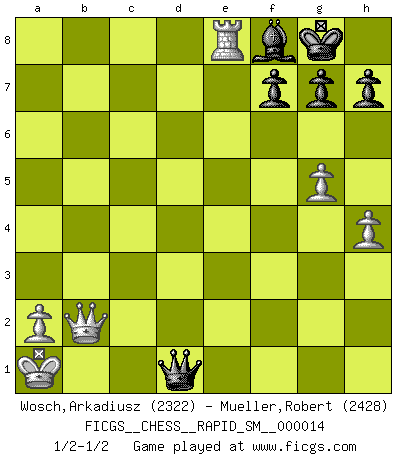 Last move : 1/2-1/2 2017 June 27 20:18:39 [Event "FICGS__CHESS__RAPID_SM__000014"] [Site "FICGS"] [Date "2017.03.16"] [Round "1"] [White "Wosch,Arkadiusz"] [Black "Mueller,Robert"] [Result "1/2-1/2"] [WhiteElo "2322"] [BlackElo "2428"] 1.e4 c5 2.Nf3 d6 3.d4 cxd4 4.Nxd4 Nf6 5.Nc3 a6 6.Be3 e5 7.Nb3 Be7 8.f3 O-O 9.Qd2 Be6 10.O-O-O b5 11.g4 Nbd7 12.g5 Nh5 13.Kb1 Nb6 14.Na5 Qc7 15.h4 b4 16.Nd5 Nxd5 17.exd5 Bd7 18.Qxb4 Ng3 19.Rg1 Rab8 20.Qd2 Nxf1 21.Rgxf1 Rb5 22.Nc6 Bxc6 23.dxc6 Qxc6 24.f4 a5 25.fxe5 Rfb8 26.Bd4 dxe5 27.Bc3 a4 28.b3 axb3 29.cxb3 e4 30.Qd4 Bf8 31.Rd2 R5b7 32.Re1 Re8 33.Kb2 Qa6 34.Rde2 Rc8 35.Rxe4 Qa3+ 36.Kb1 Rxb3+ 37.Bb2 R3b8 38.Re8 Rxb2+ 39.Qxb2 Qd3+ 40.Ka1 Rxe8 41.Rxe8 Qd1+ 1/2-1/2 Sicilian : Najdorf, Byrne (English) attack Kingside Castling by player Black (move 8) Queenside Castling by player White (move 10) This chess game ended in a draw. Follow this game move after move (download)There is no remorse like the remorse of Chess. (H. G. Wells) Du kannst im Schach nur gut werden, wenn du das Spiel liebst. (Robert James Fischer) El ganar no lo es todo... pero el perder es nada. (Mednis) Pour moi, les échecs ne sont pas un jeu mais un art. (Alexandre Alekhine) You know what they say : You lie down with the Devil, you wake up in Hell. (Horatio Caine, C.S.I. Miami)