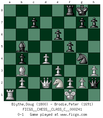 Last move : 0-1 2017 April 21 21:41:27 [Event "FICGS__CHESS__CLASS_C__000241"] [Site "FICGS"] [Date "2017.03.18"] [Round "1"] [White "Blythe,Doug"] [Black "Brodie,Peter"] [Result "0-1"] [WhiteElo "1800"] [BlackElo "1691"] 1.d4 d5 2.Bf4 f5 3.e3 Nf6 4.Nf3 Nc6 5.Ne5 e6 6.c4 dxc4 7.Bxc4 Nxe5 8.Bxe5 Bd6 9.Bxd6 Qxd6 10.Nc3 O-O 11.Bb3 Bd7 12.Qd2 a5 13.a3 b5 14.O-O b4 15.axb4 axb4 16.Ne2 Rxa1 17.Rxa1 Ng4 18.h3 Qh2+ 19.Kf1 Bb5 0-1 Queen's pawn, Mason variation Kingside Castling by player Black (move 10) Kingside Castling by player White (move 14) Player Black won this chess game. Follow this game move after move (download)In Chess, just as in life, today's bliss may be tomorrow's poison. (Assaic) Mit Schach schule ich mein Gefühl für Geometrie, was für Tennis und Schach gleichermaßen wichtig ist. (Boris Becker) Vive, pierde y aprende al observar a tu oponente como ganar. (Amber Steenbock) On n'a jamais que l'âge auquel on a commence à jouer aux échecs car après on cesse de vieillir. (Capablanca) Beep ! (R2D2 in Star Wars ep.3)